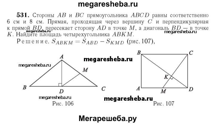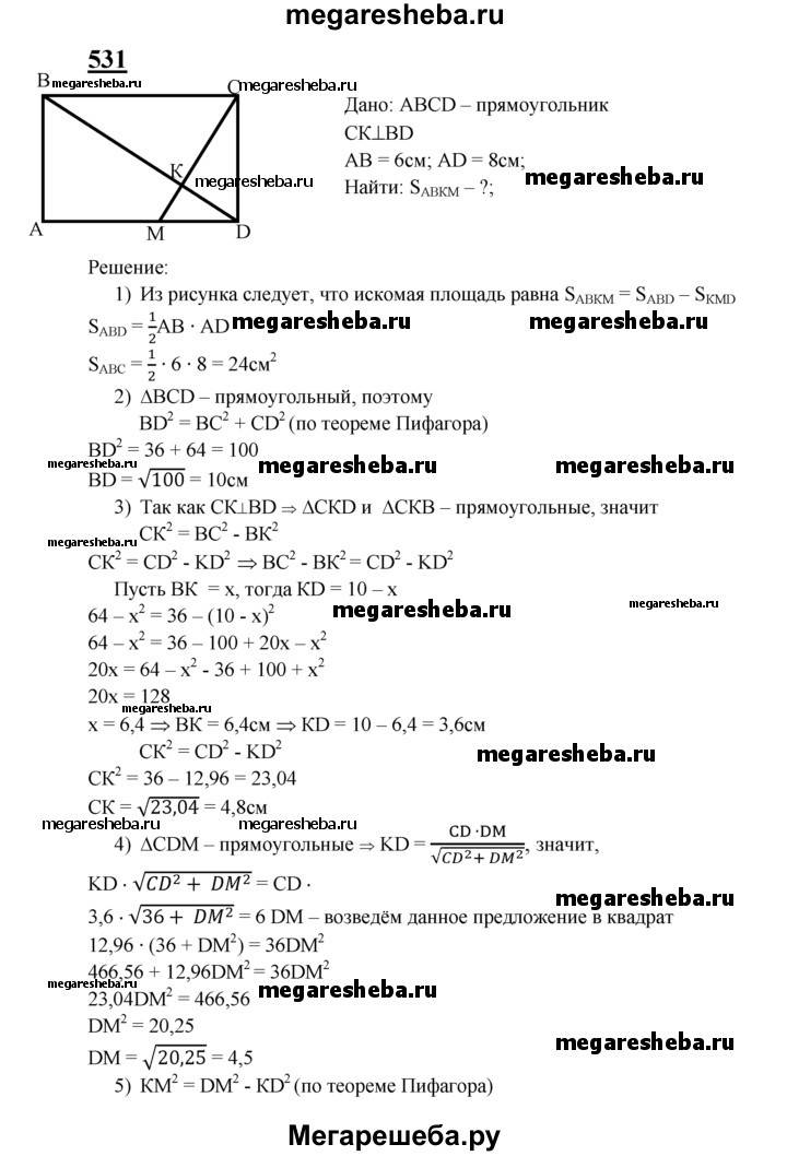 531 Стороны АВ и ВС прямоугольника ABCD равны соответственно 6 см и 8 см. Прямая, проходящая через вершину С и перпендикулярная к прямой BD, пересекает сторону AD в точке М, а диагональ BD — в точке К. Найдите площадь четырёхугольника АВКМ.