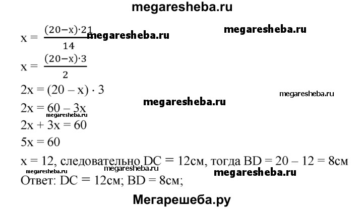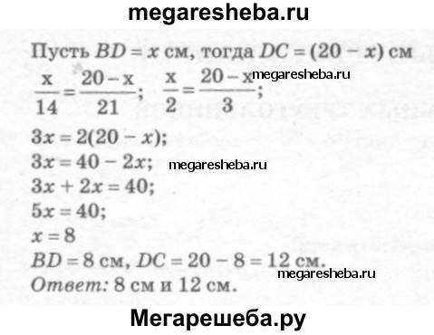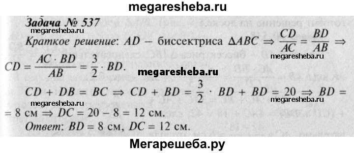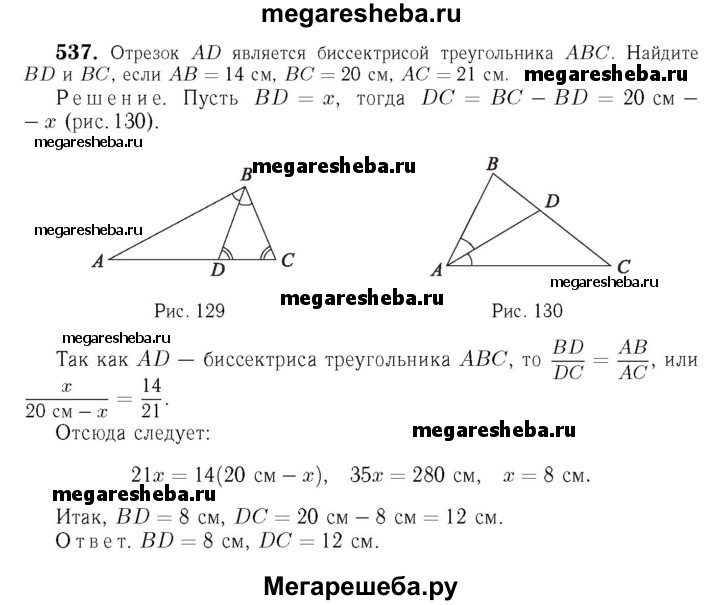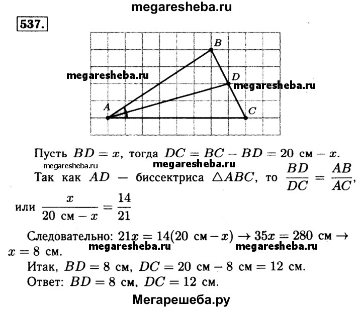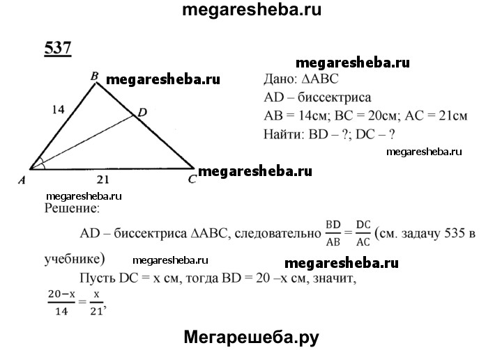 537 Отрезок AD является биссектрисой треугольника ABC. Найдите BD и DC, если АВ = 14 см, ВС = 20 см, АС = 21 см.