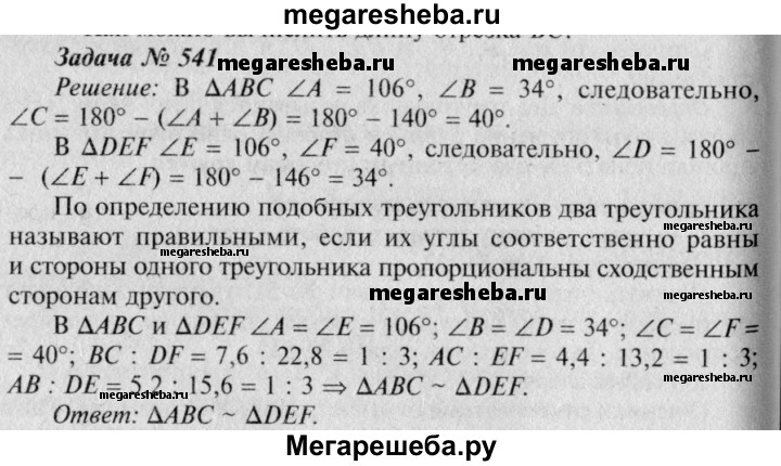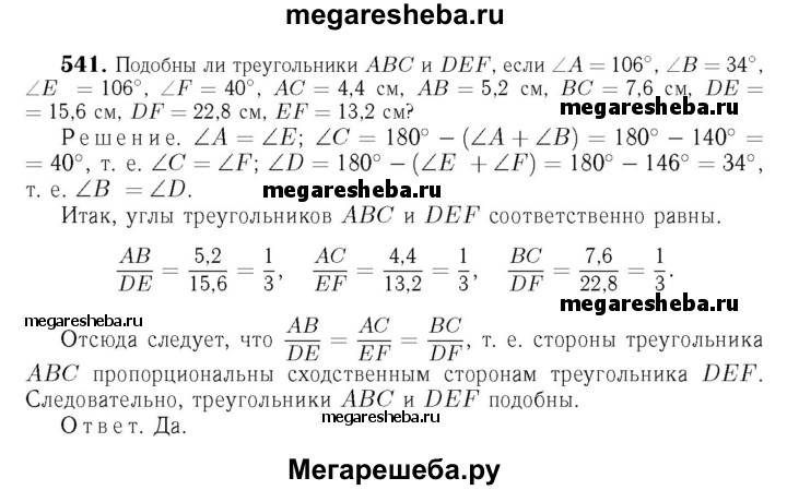 541 Подобны ли треугольники ABC и DEF, если ∠A = 106°, ∠B = 34°, АЕ = 106°, AF = 40°, АС = 4,4 см, АВ = 5,2 см, ВС = = 7,6см, DE = 15,6 см, DF = 22,8 см, EF=13,2см?