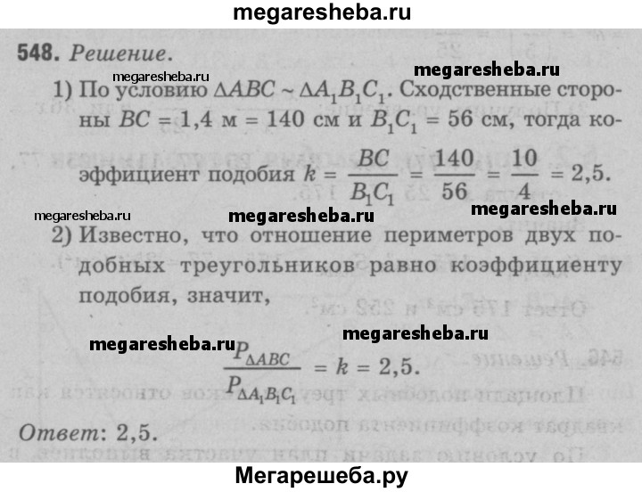 548 Треугольники ABC и А1В1С1 подобны. Сходственные стороны ВС и В1С1 соответственно равны 1,4 м и 56 см. Найдите отношение периметров треугольников ABC и А1В1С1.