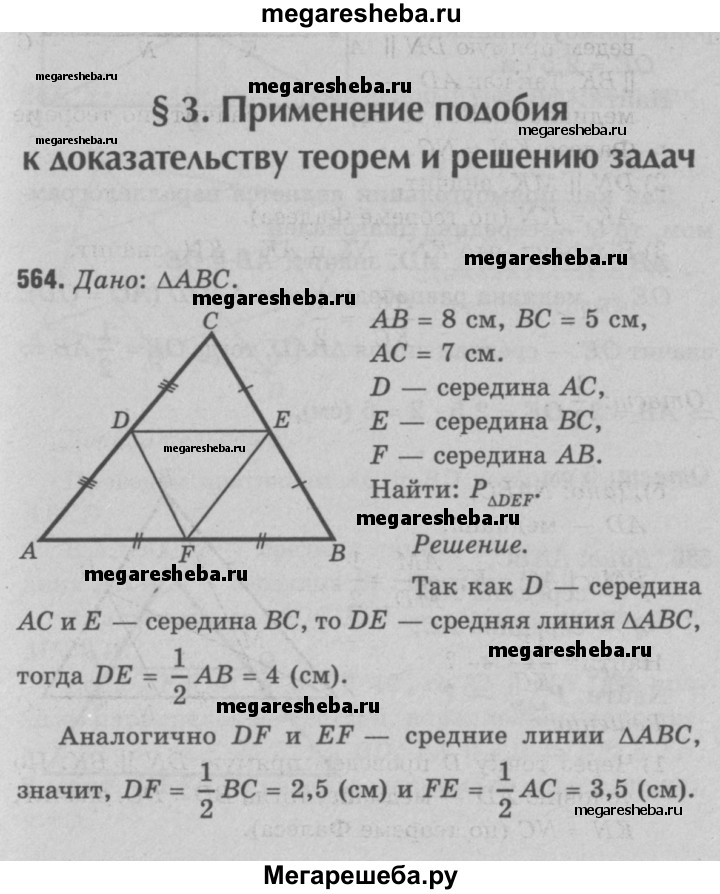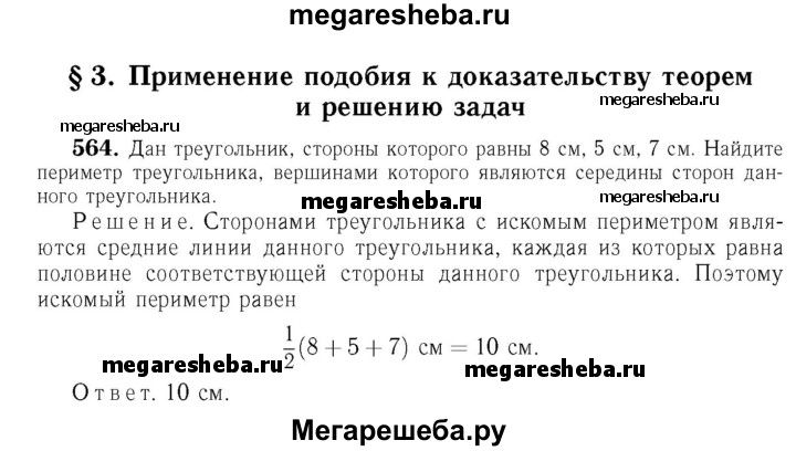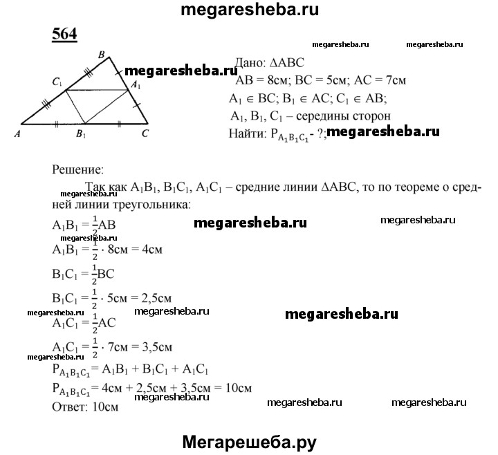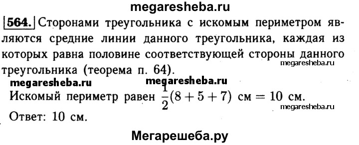 564 S Дан треугольник, стороны которого равны 8 см, 5 см и 7 см. Найдите периметр треугольника, вершинами которого являются середины сторон данного треугольника.