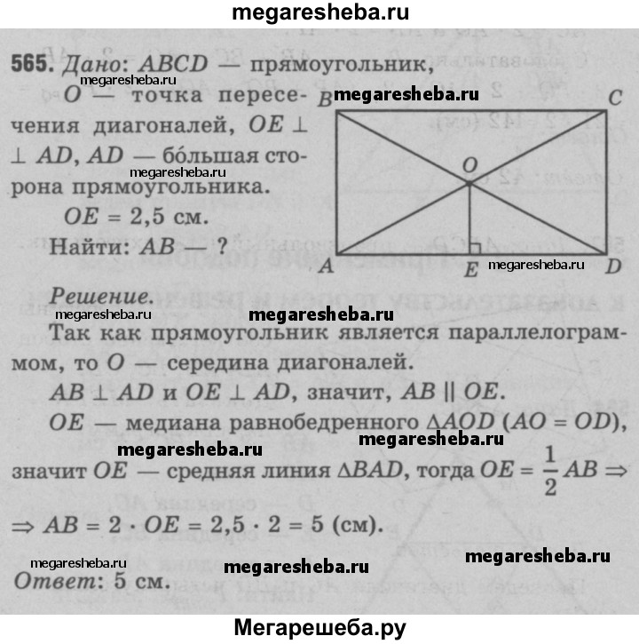 565 Расстояние от точки пересечения диагоналей прямоугольника до прямой, содержащей его большую сторону, равно 2,5 см. Найдите меньшую сторону прямоугольника.