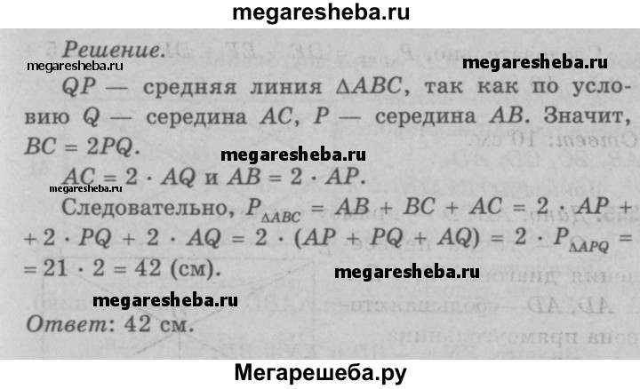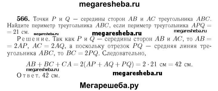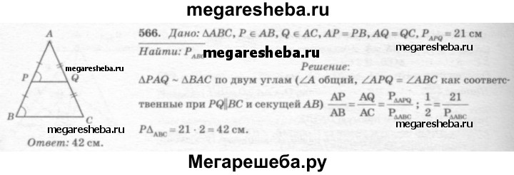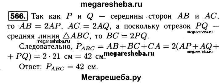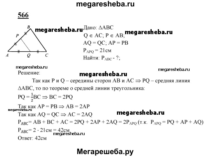 566 S Точки Р и Q — середины сторон АВ и АС треугольника ABC. Найдите периметр треугольника ABC, если периметр треугольника APQ равен 21 см.