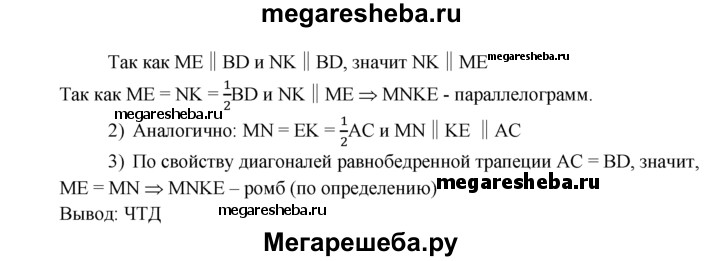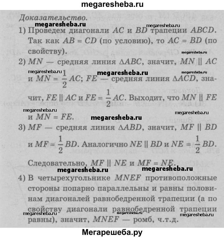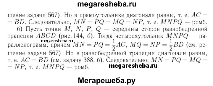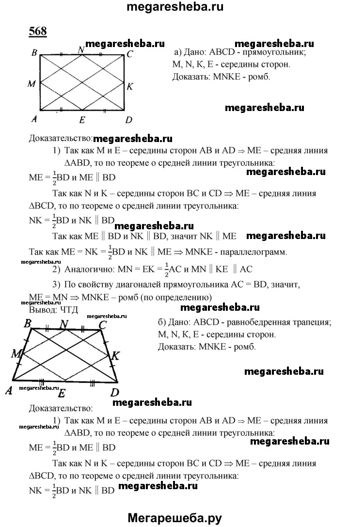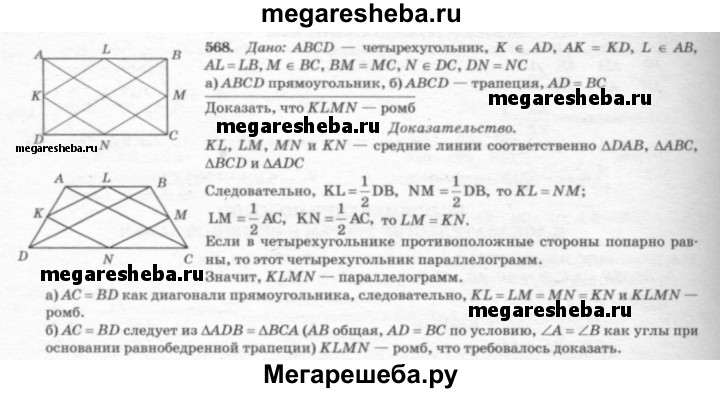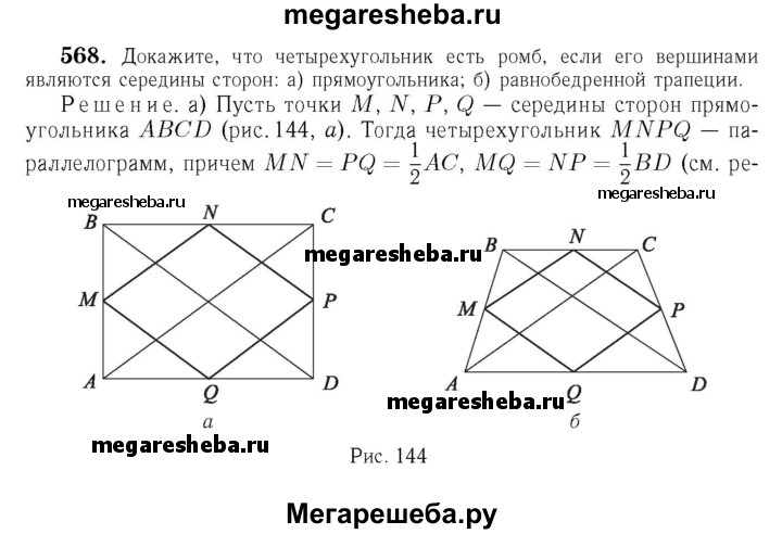 568 Докажите, что четырёхугольник — ромб, если его вершинами являются середины сторон: а) прямоугольника; б) равнобедренной трапеции.