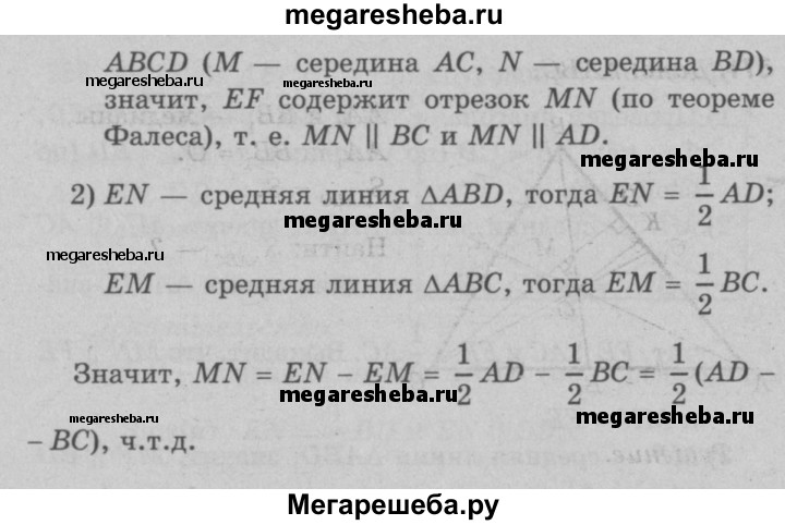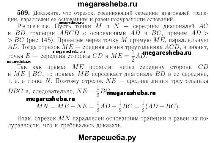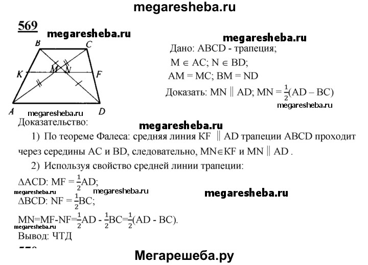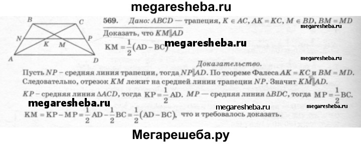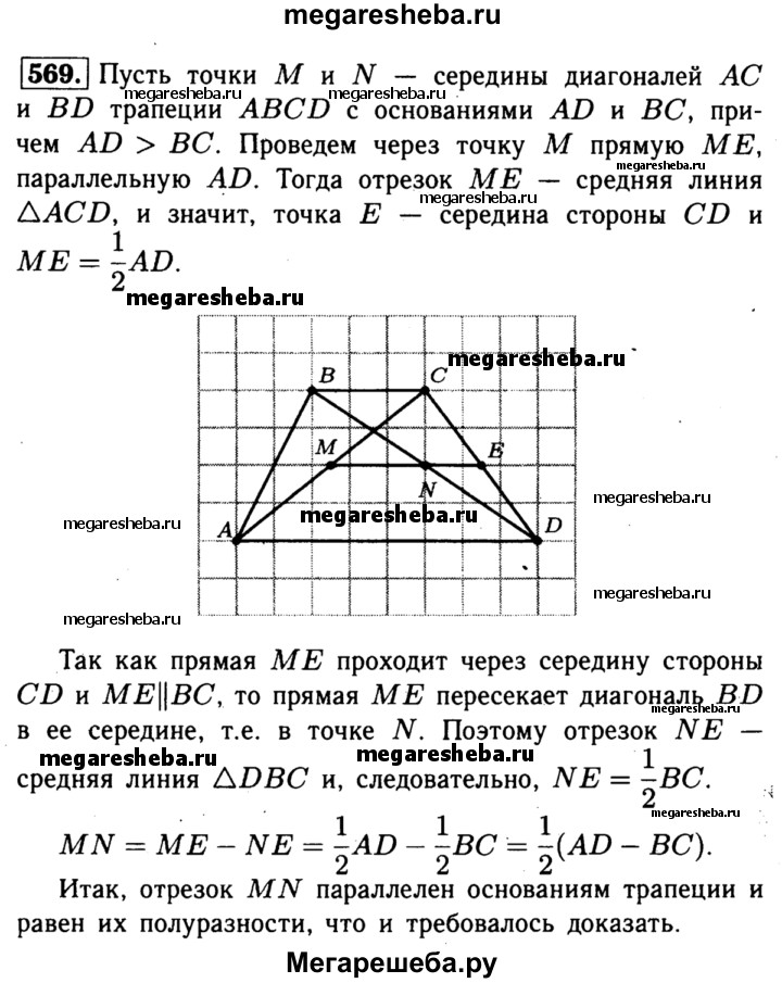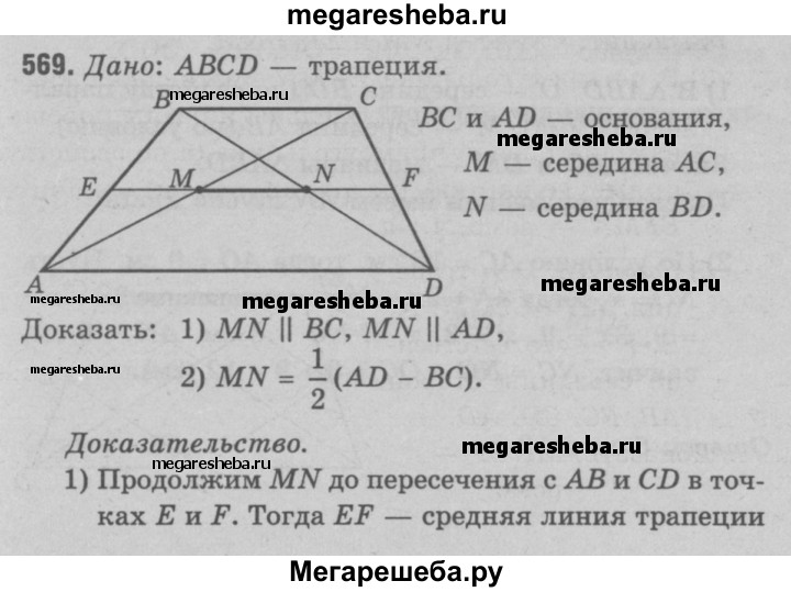 569 Докажите, что отрезок, соединяющий середины диагоналей трапеции, параллелен её основаниям и равен полуразности оснований.