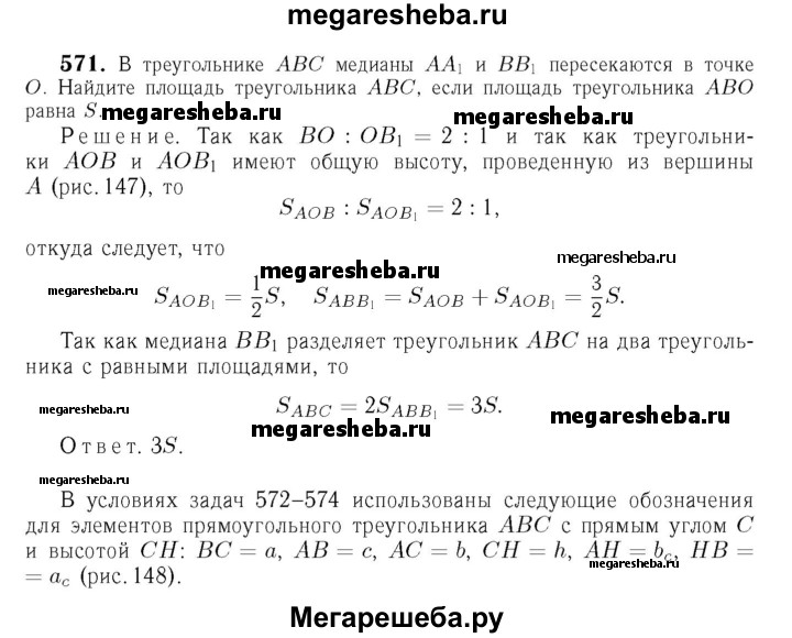 571 S В треугольнике ABC медианы ААХ и ВВХ пересекаются в точке О. Найдите площадь треугольника ABC, если площадь треугольника АВО равна S. В задачах 572—574 использованы следующие обозначения для прямоугольного треугольника ABC с прямым углом С и высотой СН: ВС = а, СА = Ь, АВ = с, CH = h, АН = BС, НВ = ас.