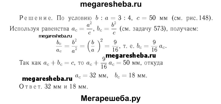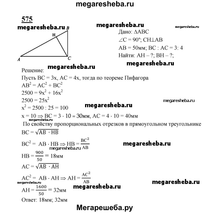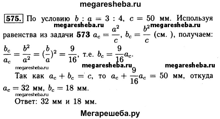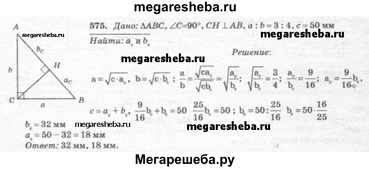 575 Катеты прямоугольного треугольника относятся как 3:4, а гипотенуза равна 50 мм. Найдите отрезки, на которые гипотенуза делится высотой, проведённой из вершины прямого угла.
