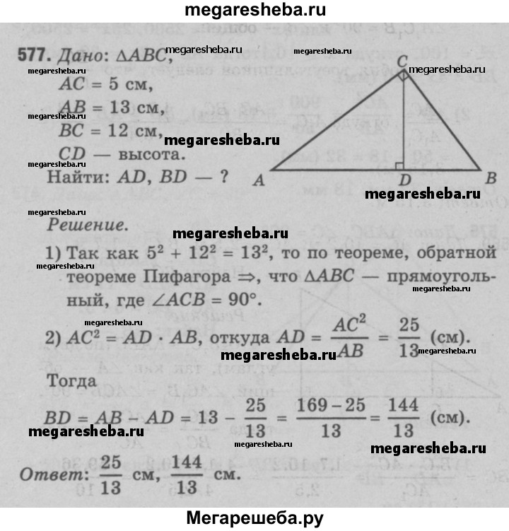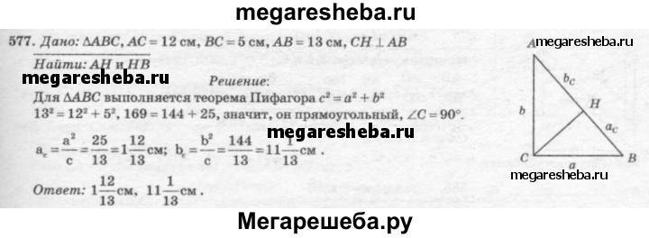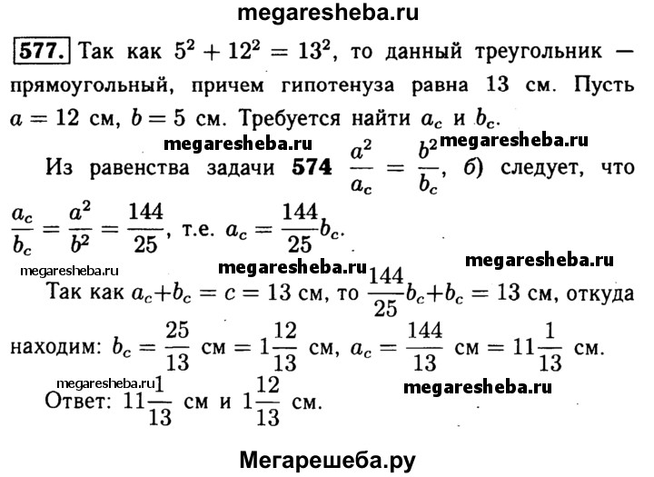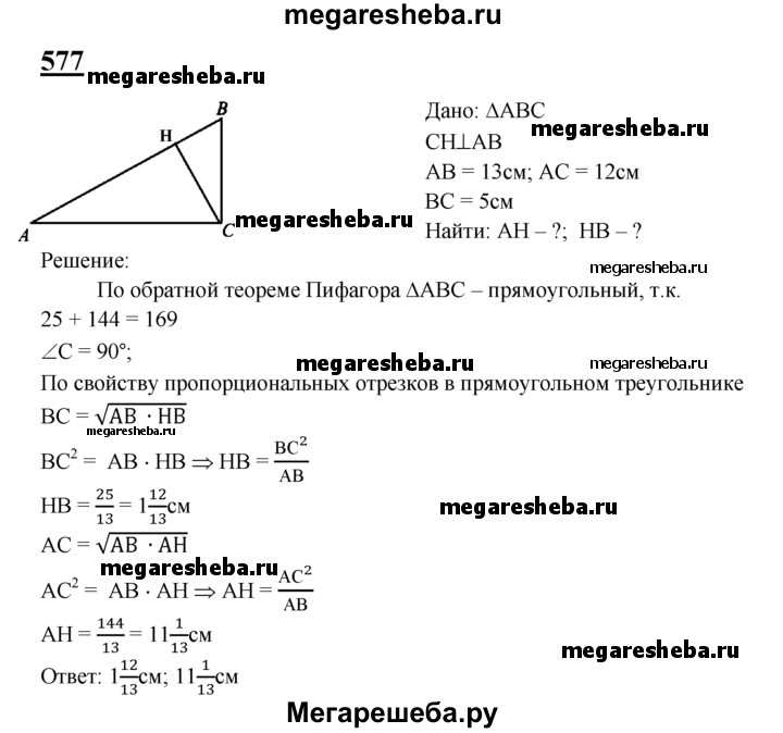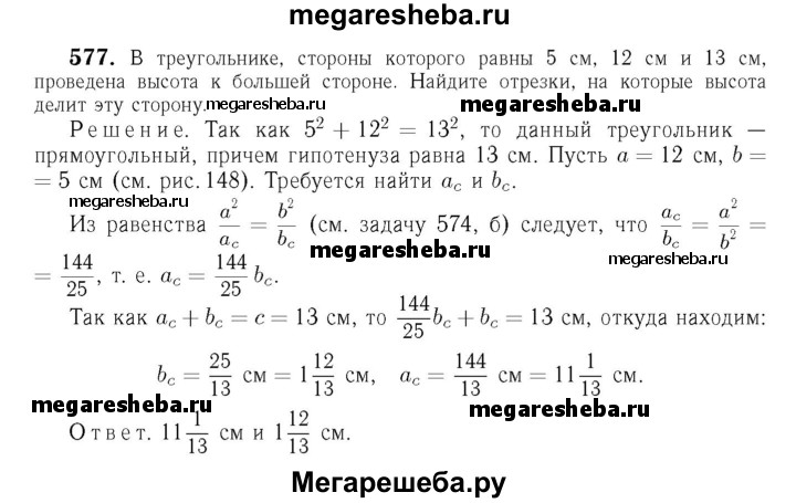 577 В треугольнике, стороны которого равны 5 см, 12 см и 13 см, проведена высота к его большей стороне. Найдите отрезки, на которые высота делит эту сторону.