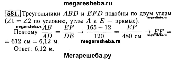 581 Для определения высоты дерева можно использовать зеркало так, как показано на рисунке 203. Луч света FD, отражаясь от зеркала в точке D, попадает в глаз человека (точку В). Определите высоту дерева, если АС =165 см, ВС =12 см, AD = 120 см, DE = 4,8 м, ∠l = Z2.