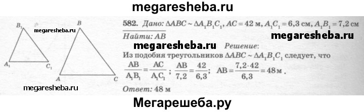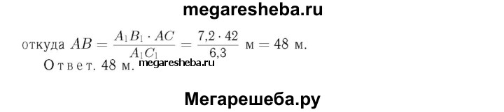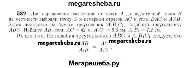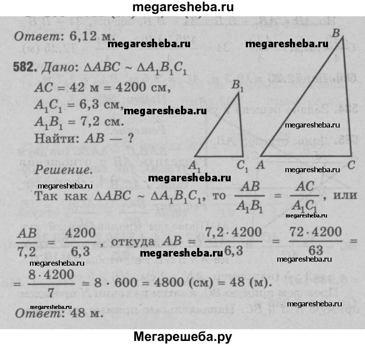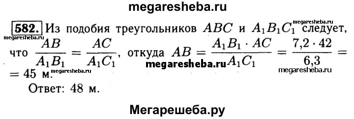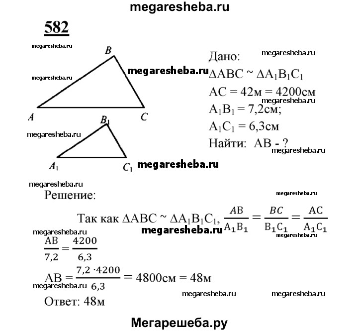 582 Для определения расстояния от точки А до недоступной точки В на местности выбрали точку С и измерили отрезок АС, углы ВАС и АС В. Затем построили на бумаге треугольник A1B1C1, подобный треугольнику ABC. Найдите АВ, если АС = 42 м, АА = 6,3 см, А1В1 = 7,2 см