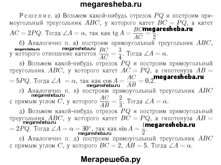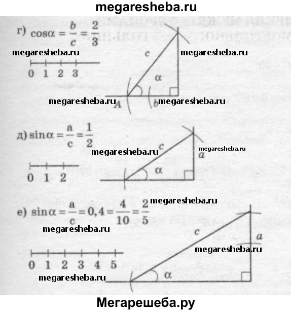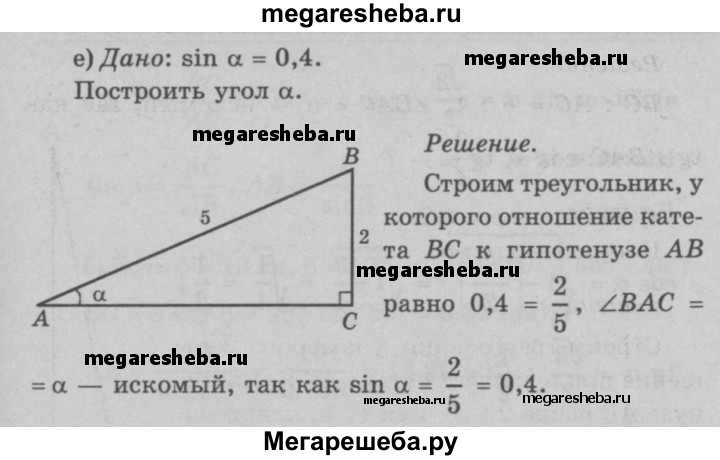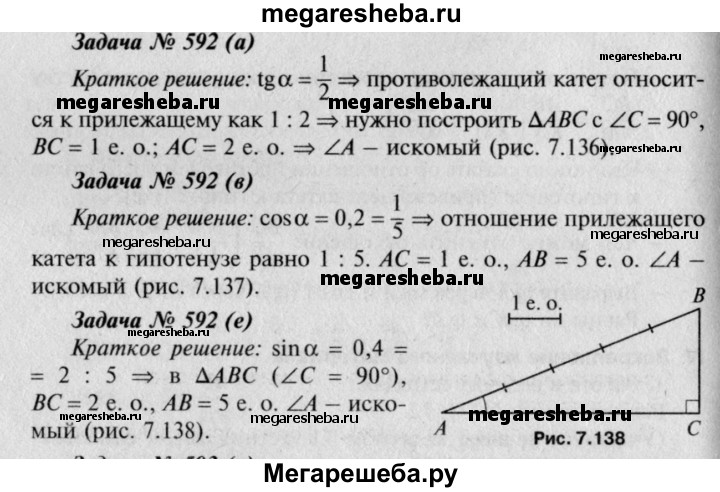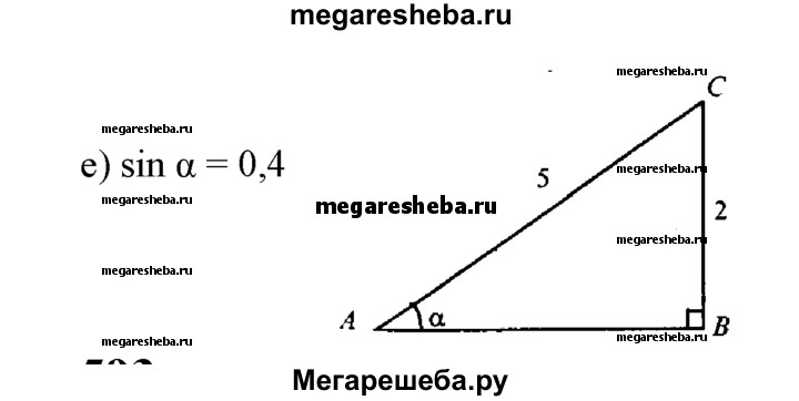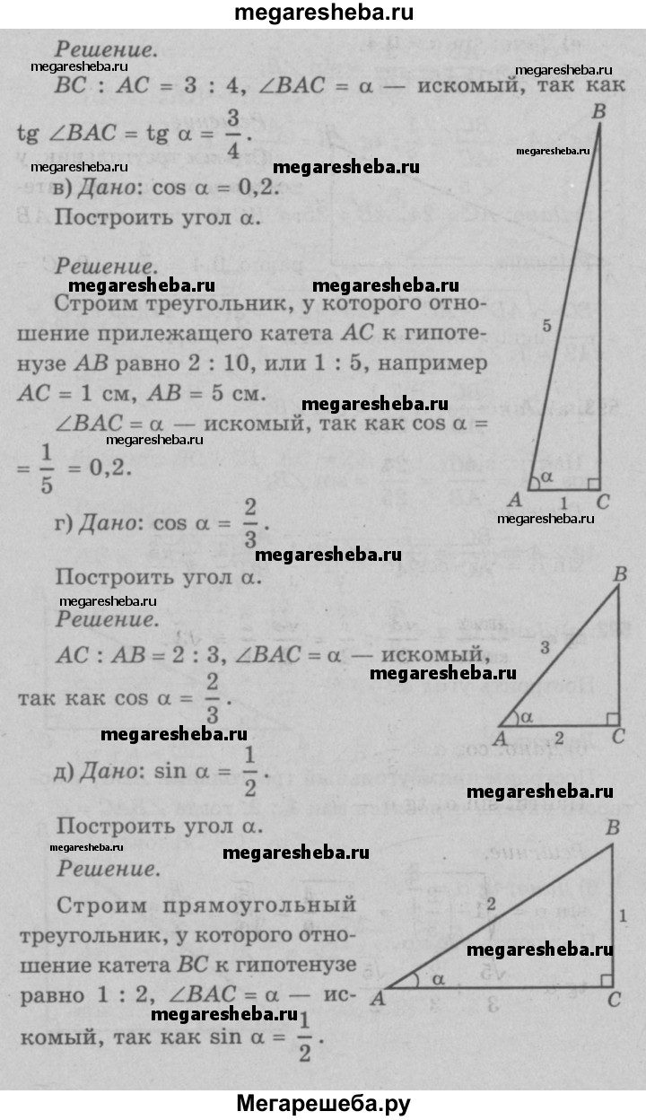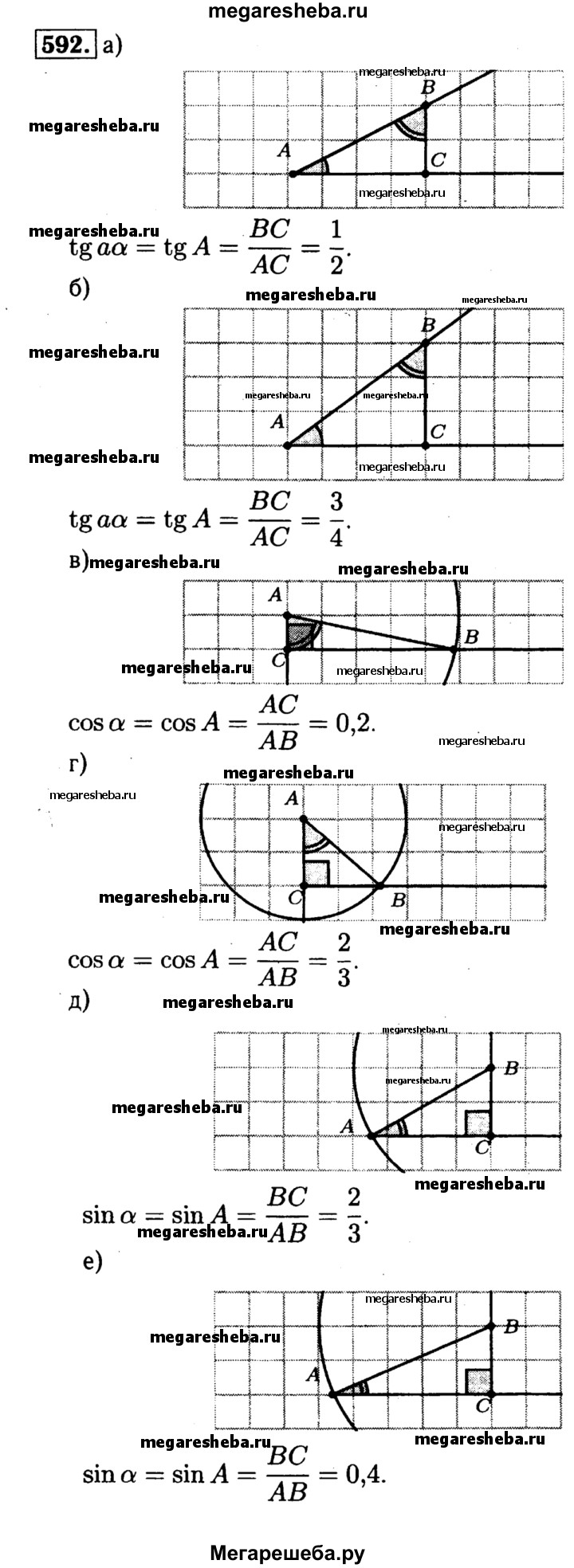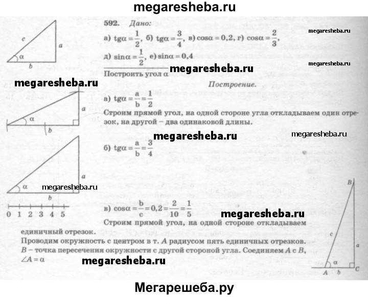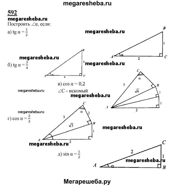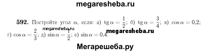 592 Постройте угол α, если: a) tgα = 1/2; б) tgα =3/4; в) cosα = 0,2; г) cos α = 2/3; д) sin α = 1/2; е) sin α = 0,4.
