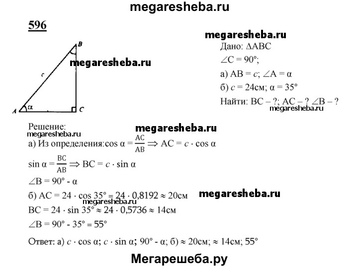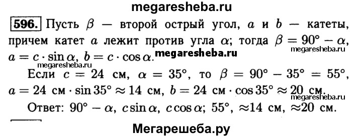 596 В прямоугольном треугольнике гипотенуза равна с, а один из острых углов равен а. Выразите второй острый угол и катеты через с и а и найдите их значения, если с = 24 см, а α = 35°.