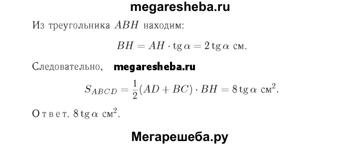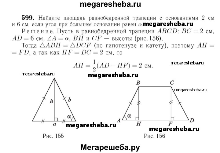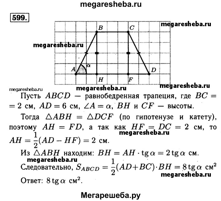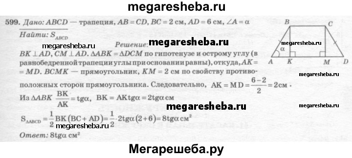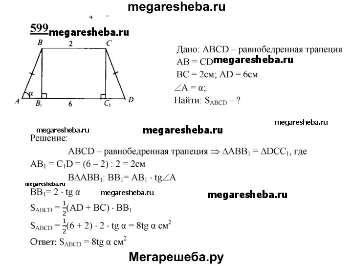 599 Найдите площадь равнобедренной трапеции с основаниями 2 см и 6 см, если угол при большем основании равен а.