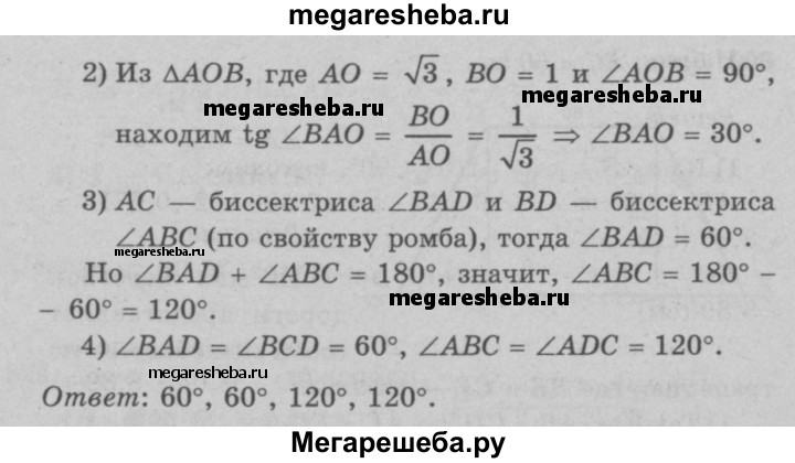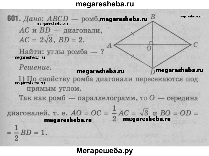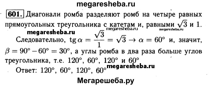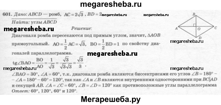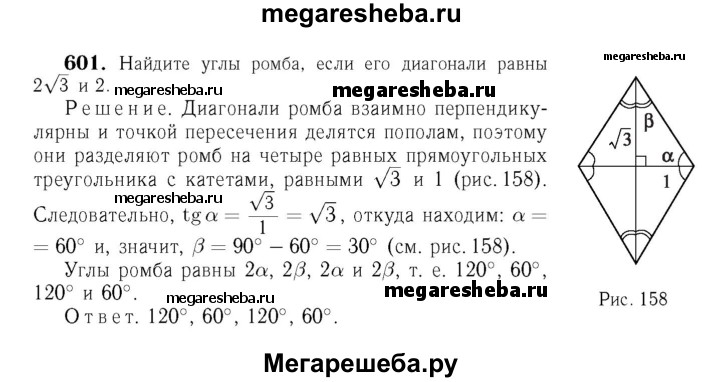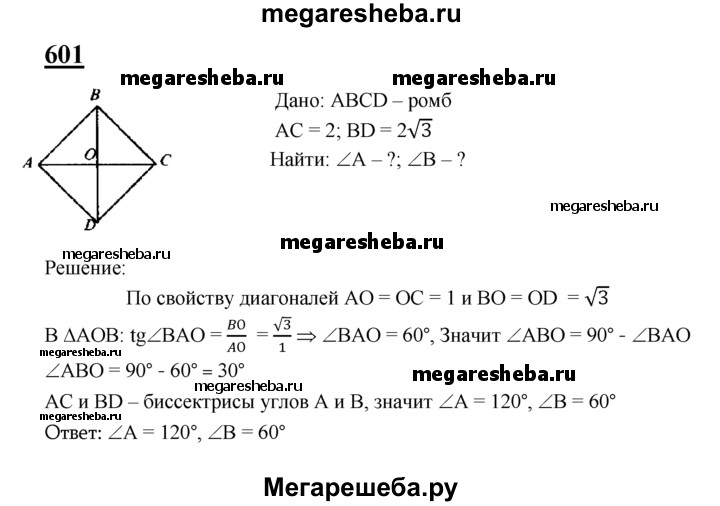 601 Найдите углы ромба с диагоналями 2√3 и 2.