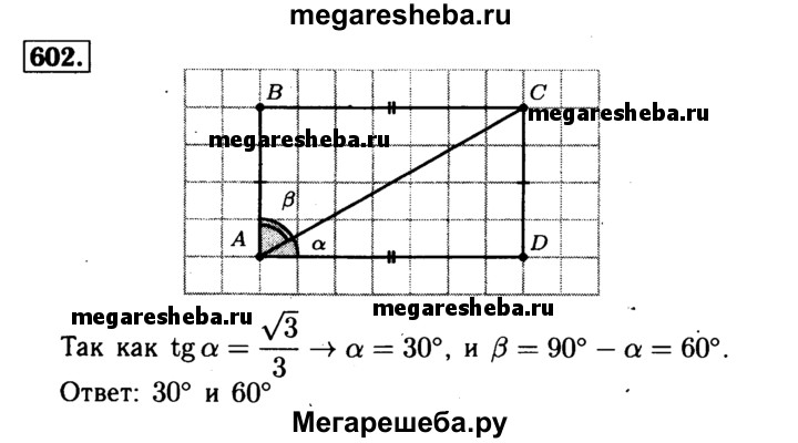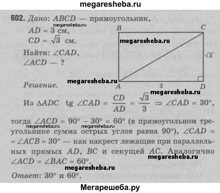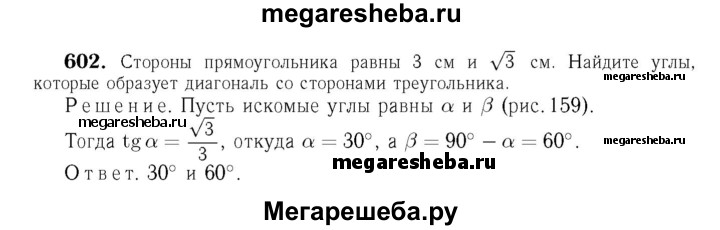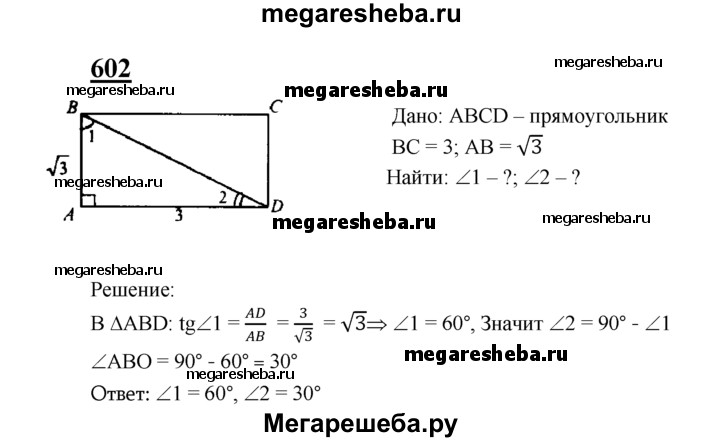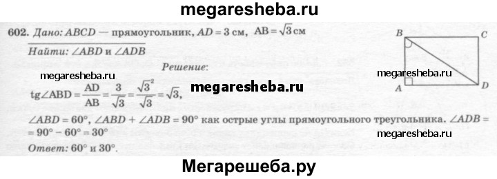 602 Стороны прямоугольника равны 3 см и см. Найдите углы, которые образует диагональ со сторонами прямоугольника.