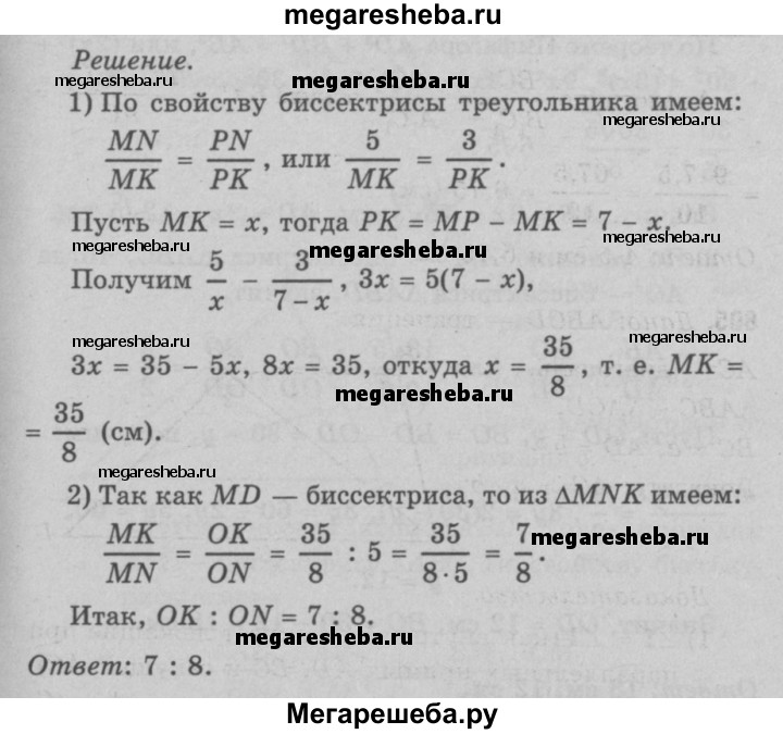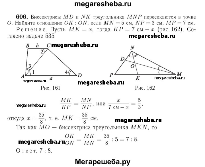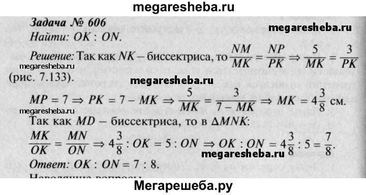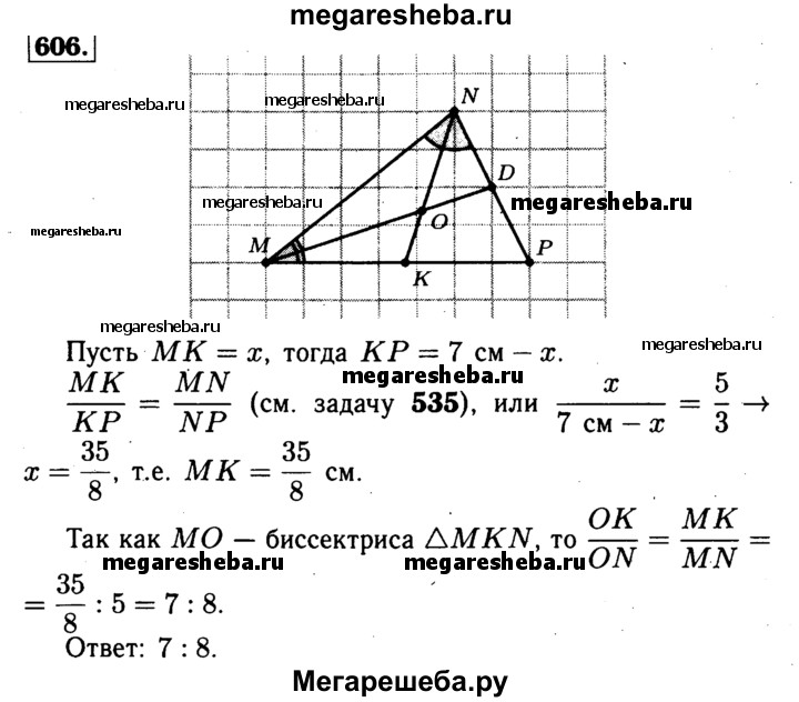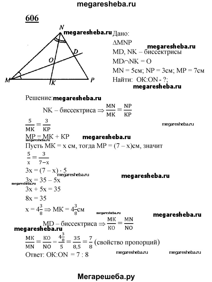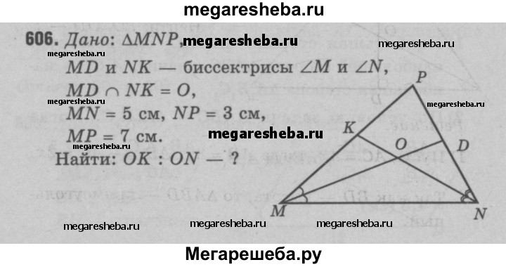 606 Биссектрисы MD и NK треугольника MNP пересекаются в точке О. Найдите отношение OK:ON, если MN = 5 см, NP = 3 см, MP = 7 см.