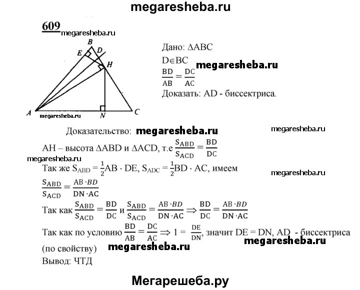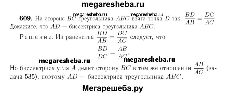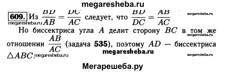 609 На стороне ВС треугольника ABC взята точка D так, что BD/AB = DC/AC. Докажите, что AD — биссектриса треугольника ABC.