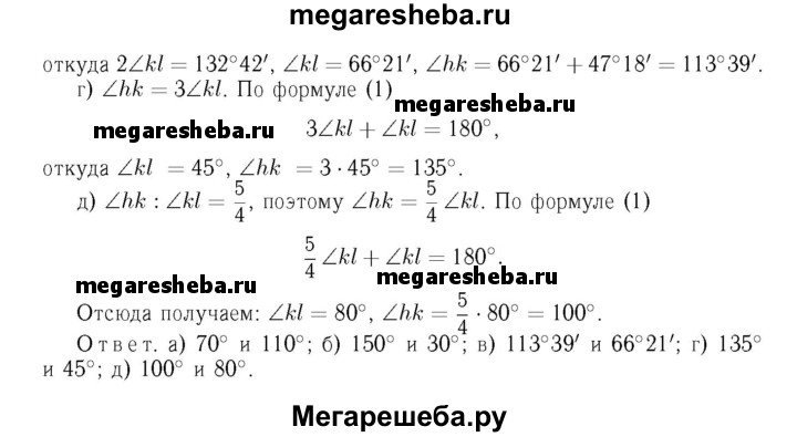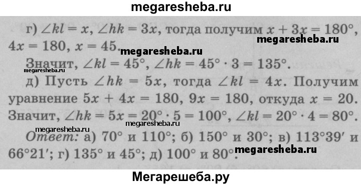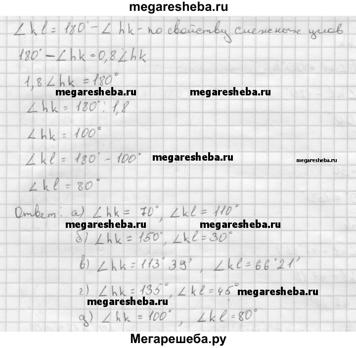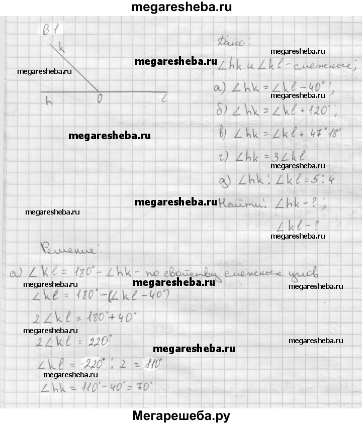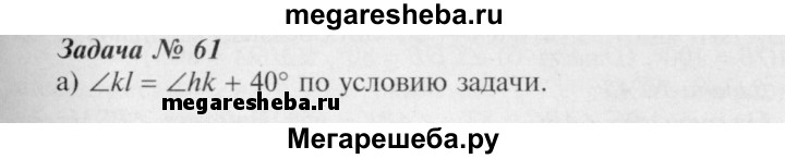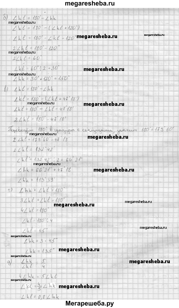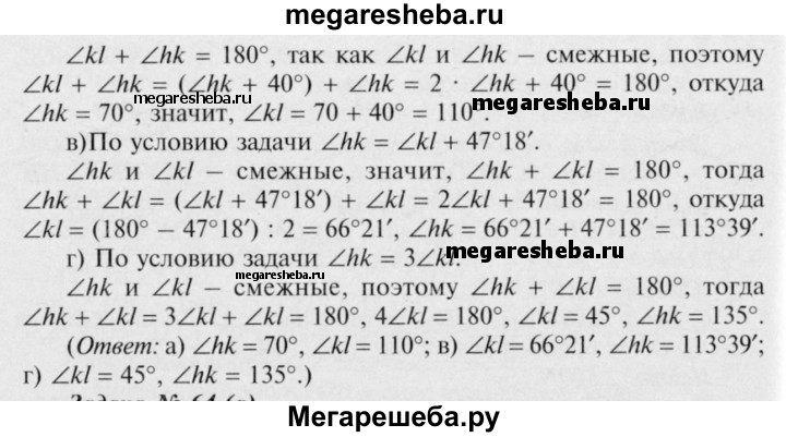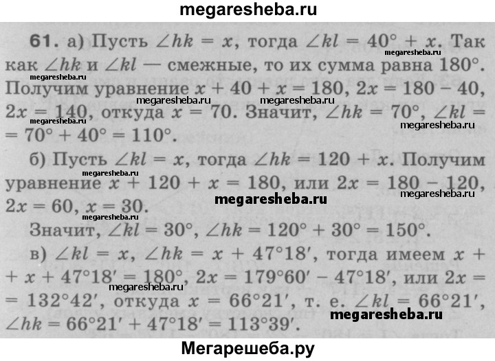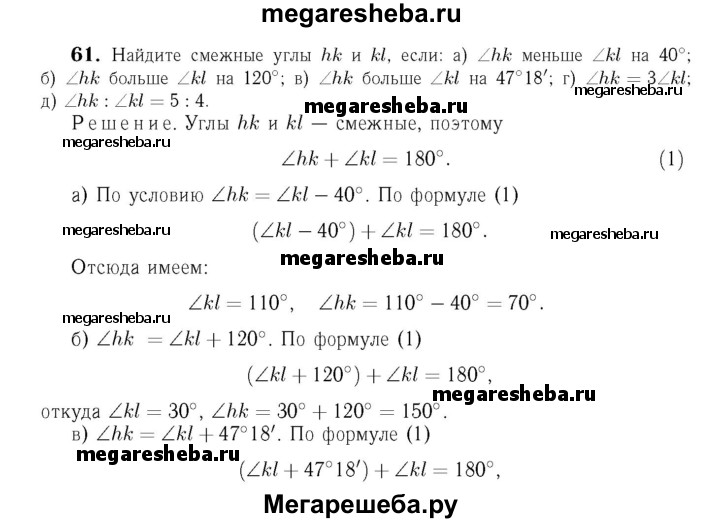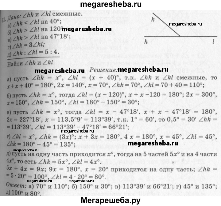 61 Найдите смежные углы hk и kl, если: а) ∠hk меньше ∠kl на 40°; б) ∠hk больше ∠kl на 120°; в) ∠hk больше ∠kl на 47°18'; г) ∠hk = 3∠kl; д) ∠hk : ∠kl = 5:4.