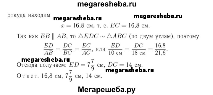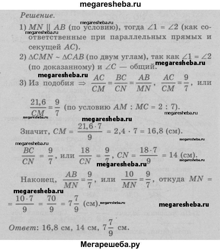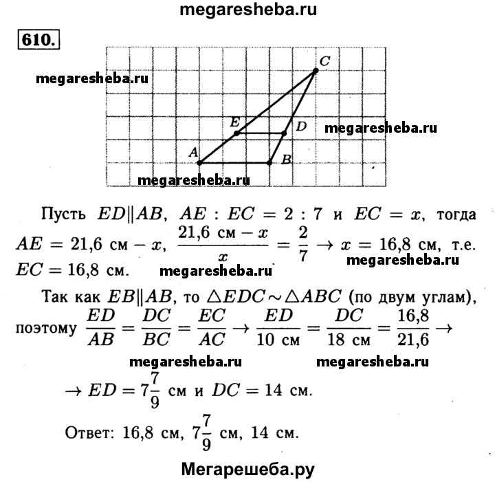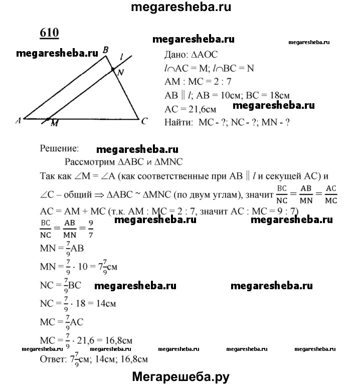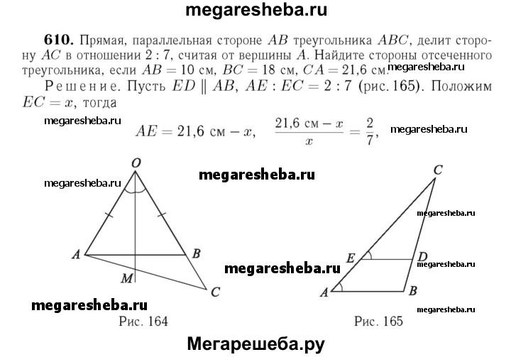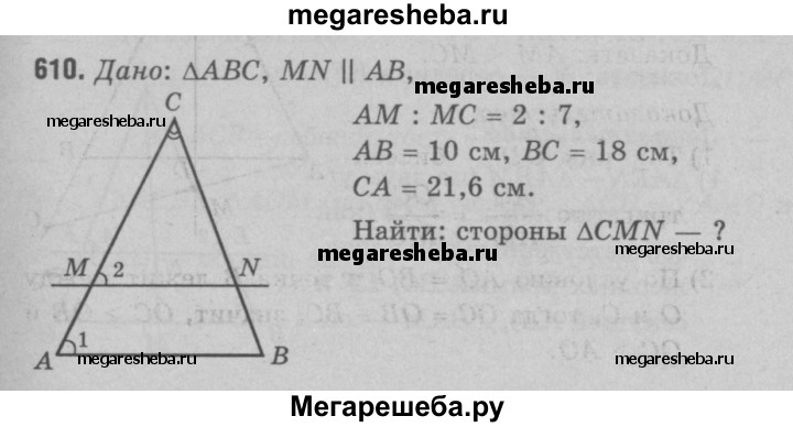 610 Прямая, параллельная стороне АВ треугольника ABC, делит сторону АС в отношении 2 : 7, считая от вершины А. Найдите стороны отсечённого треугольника, если АB =10см, ВС = 18 см, С А = 21,6 см.
