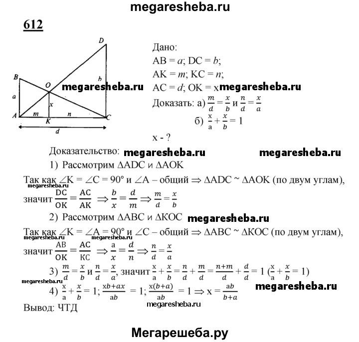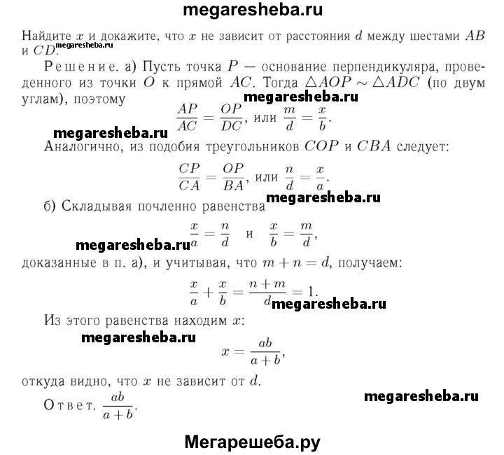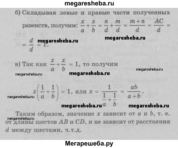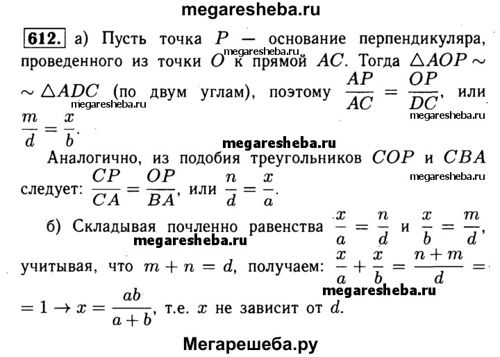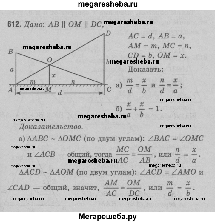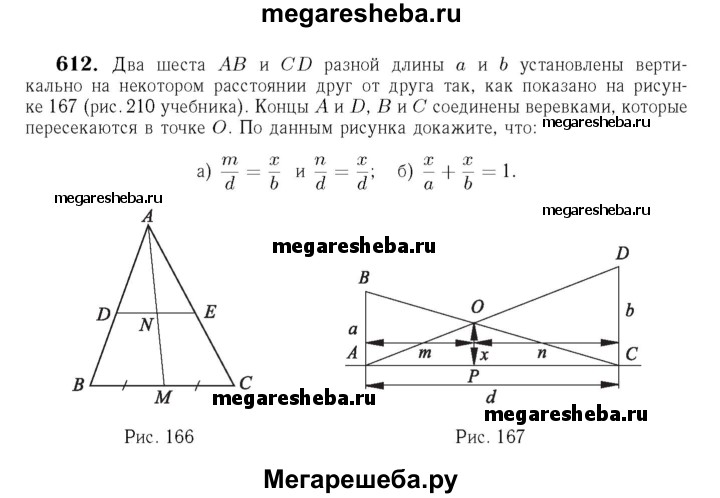 612 Два шеста АВ и CD разной длины а и b установлены вертикально на некотором расстоянии друг от друга так, как показано на рисунке 210. Концы А и D, В и С соединены верёвками, которые пересекаются в точке О. По данным рисунка докажите, что: а) m/d = x/b и n/d = x/a; б) x/a + a/b = 1. Найдите х и докажите, что х не зависит от Рис. 210 расстояния d между шестами АВ и CD.