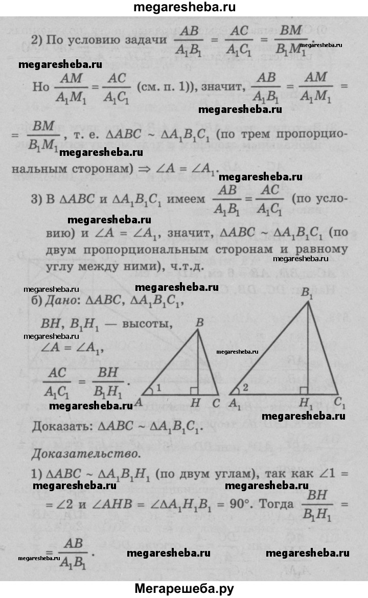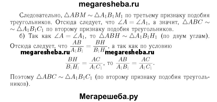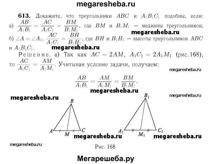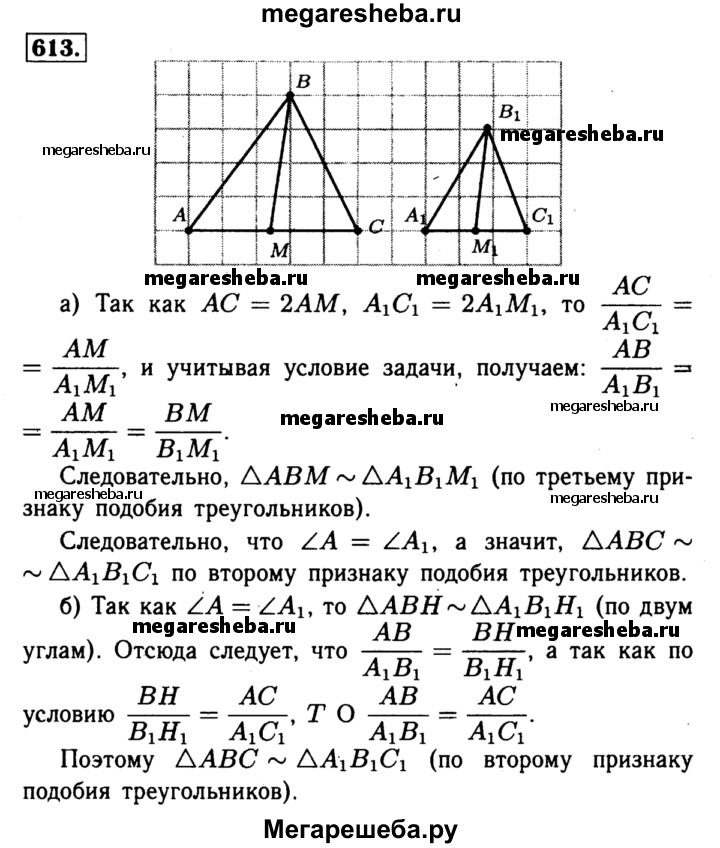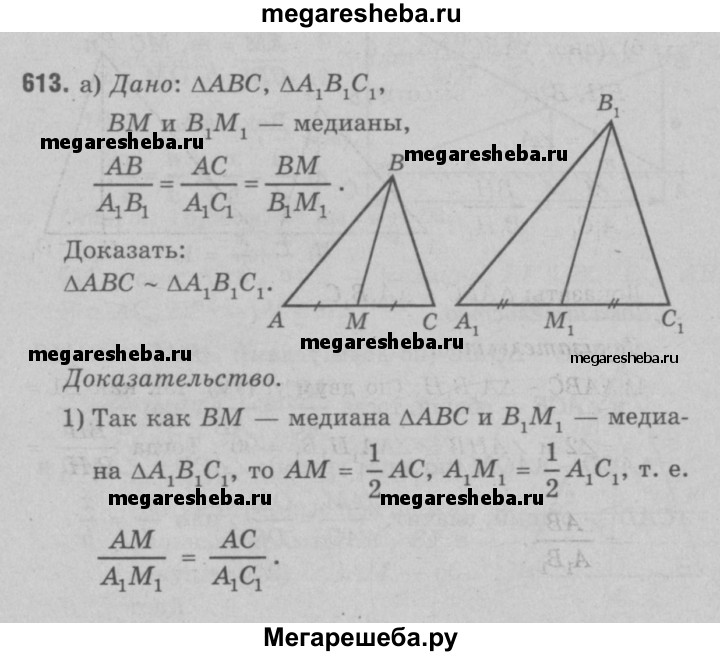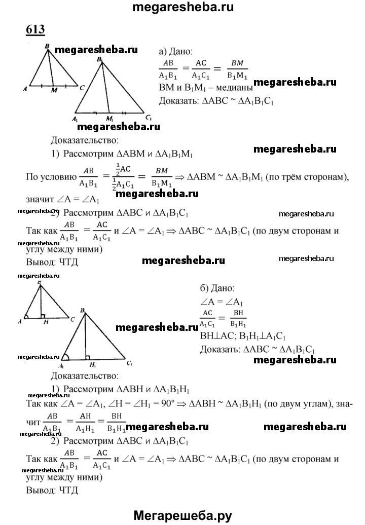 613 Докажите, что треугольники ABC и А1В1С1 подобны, если: а) AB/A1B1 =AC/A1C1=BM/B1M1, где ВМ и В1М1 — медианы треугольников; б) ∠A = ∠A1, AC/A1C1 = BH/B1H1, где ВН и В1Н1 — высоты треугольников ABC и А1В1С1.