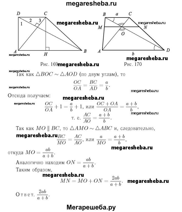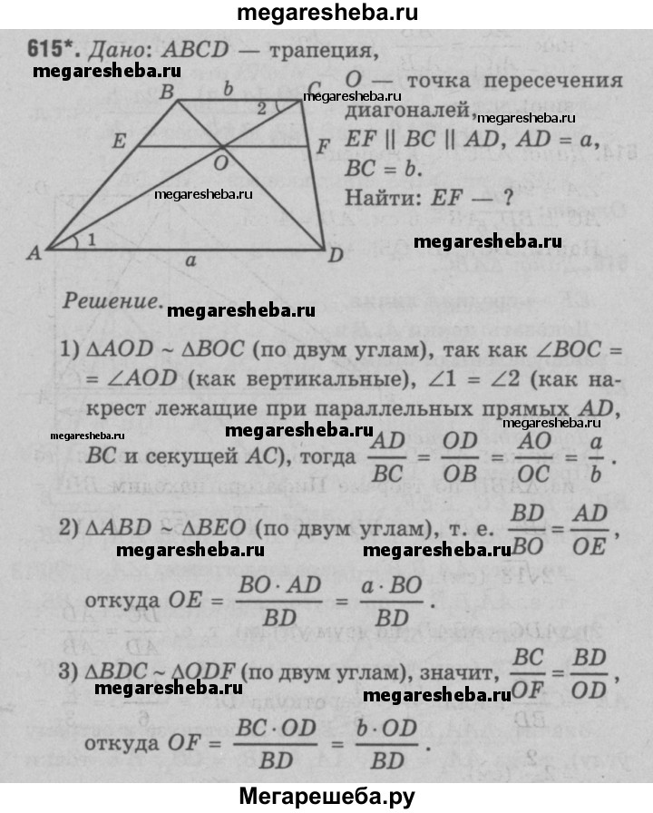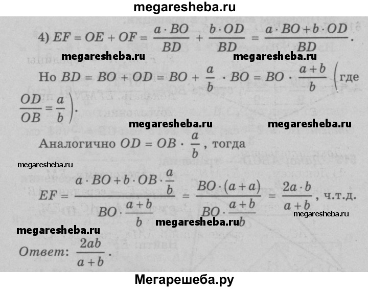615* Отрезок с концами на боковых сторонах трапеции параллелен её основаниям и проходит через точку пересечения диагоналей. Найдите длину этого отрезка, если основания трапеции равны а и b.
