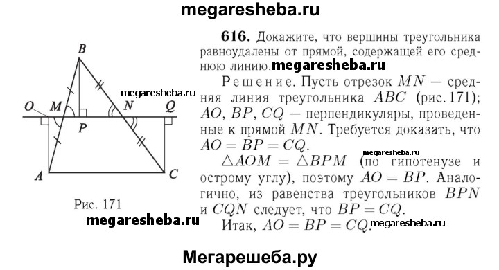 616 Докажите, что вершины треугольника равноудалены от прямой, содержащей его среднюю линию.