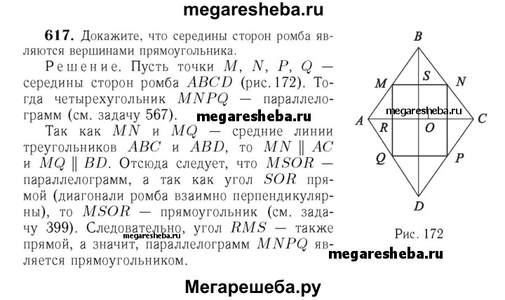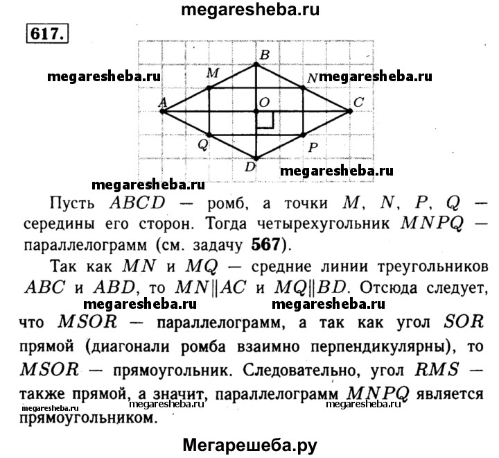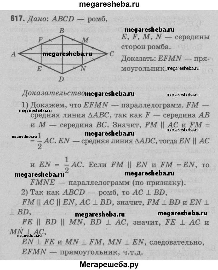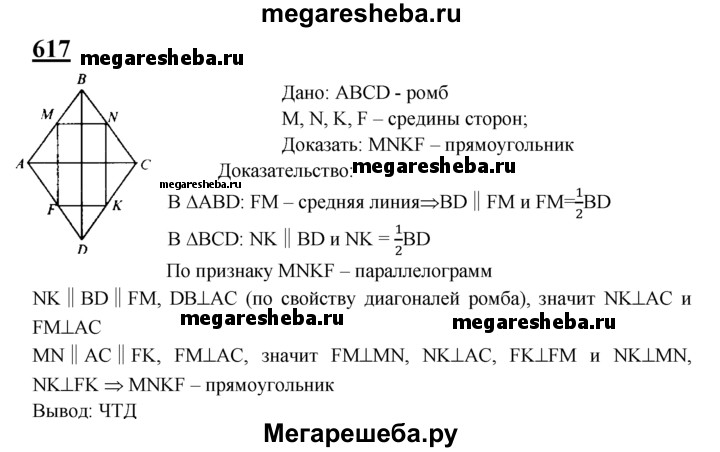 617 Докажите, что середины сторон ромба являются вершинами прямоугольника.