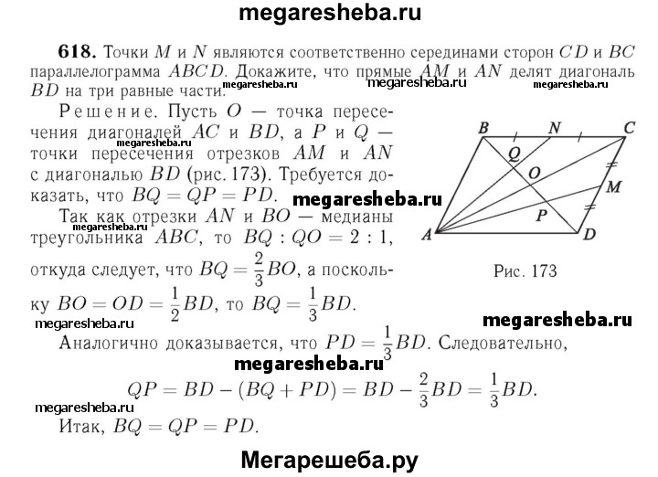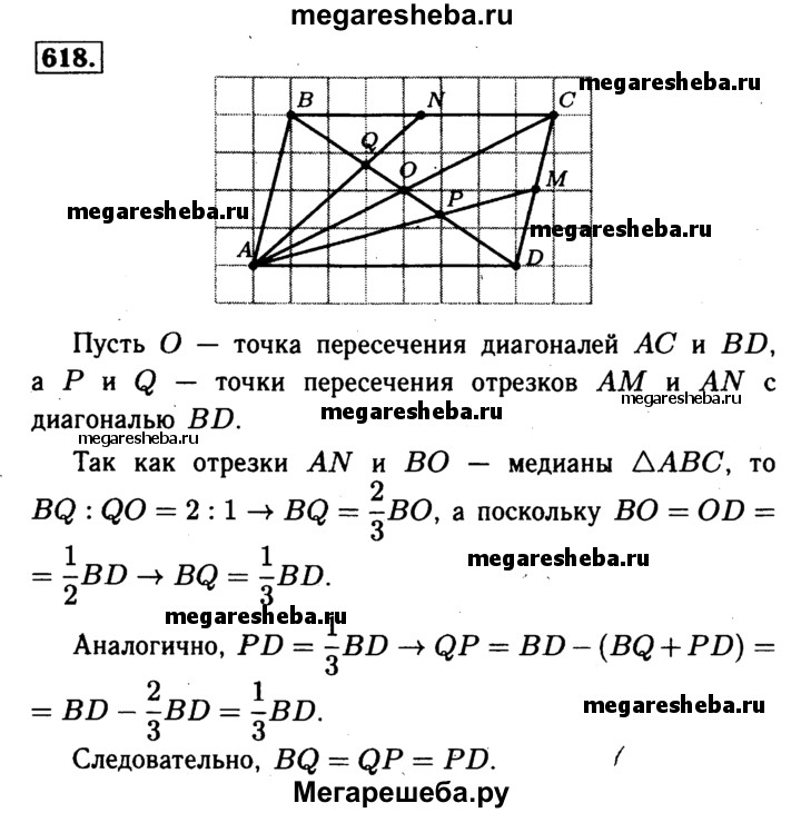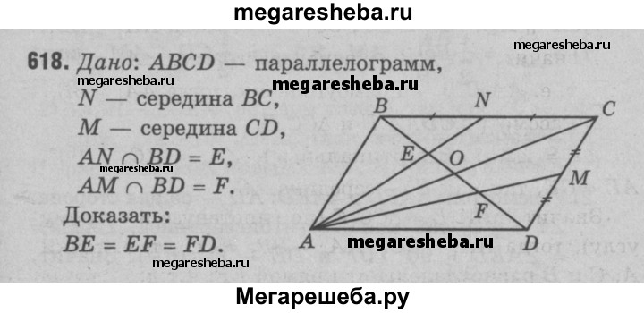 618 Точки М и N являются соответственно серединами сторон CD и ВС параллелограмма ABCD. Докажите, что прямые AM и AN делят диагональ BD на три равные части.