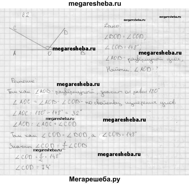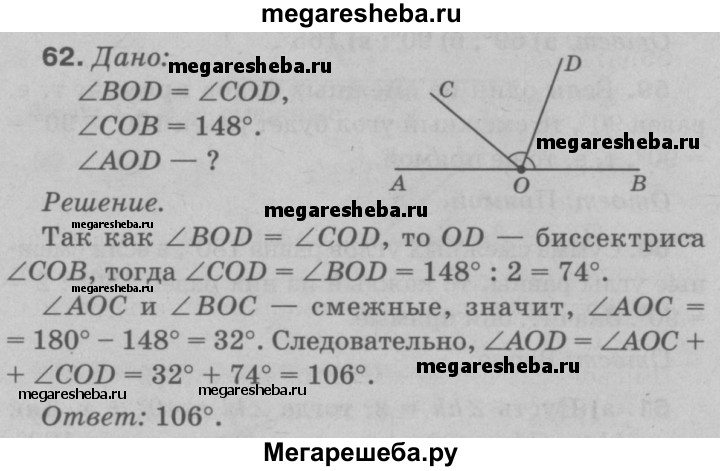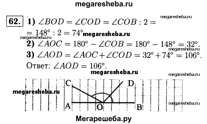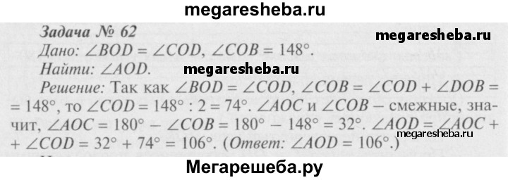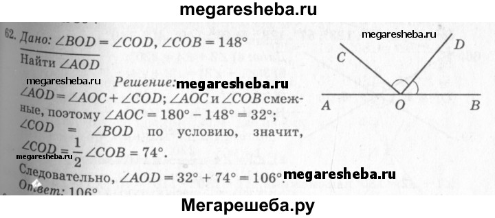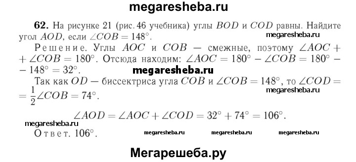 62 На рисунке 46 углы BOD и COD равны. Найдите угол AOD, если ∠COB= 148°.