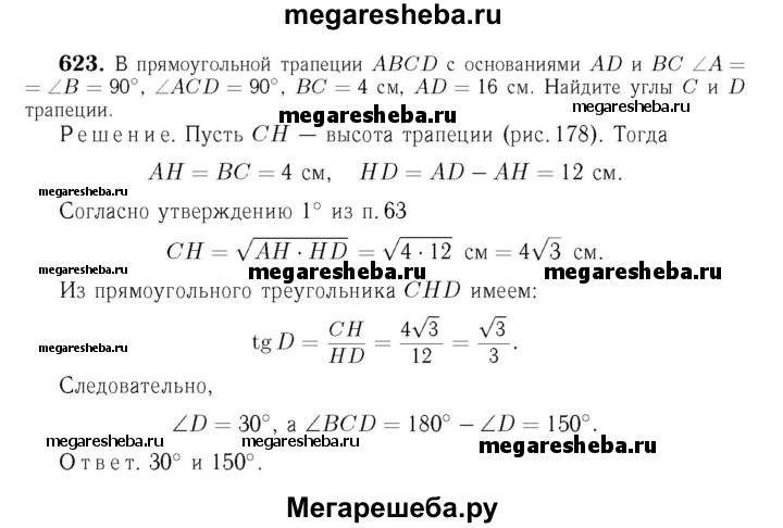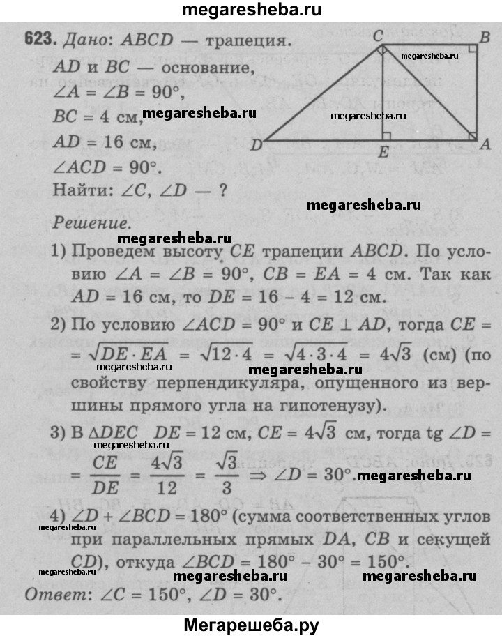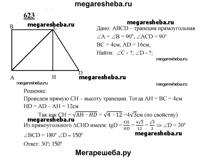 623 В прямоугольной трапеции ABCD с основаниями AD и ВС ∠A = ∠B = 90°, ∠ACD = 90°, ВС = 4 см, AD= 16 см. Найдите углы С и D трапеции.