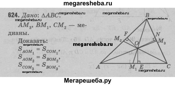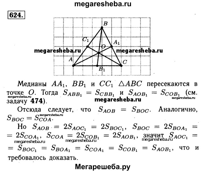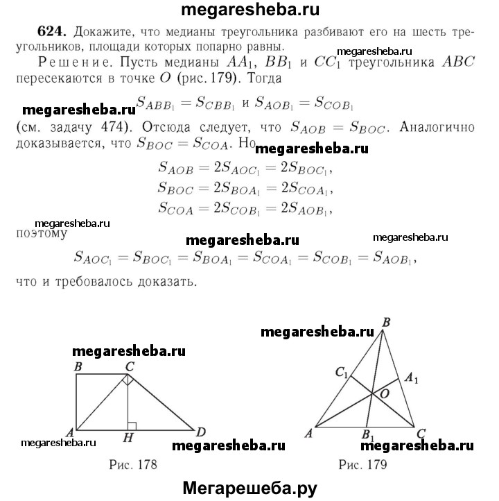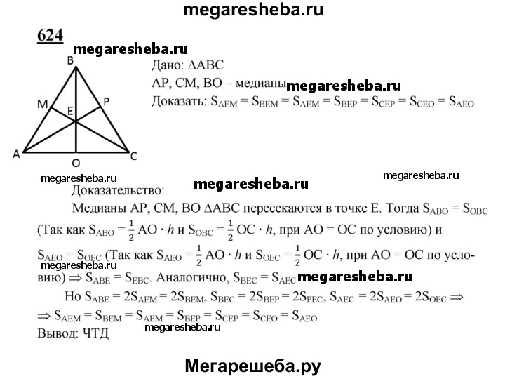 624 Докажите, что медианы треугольника разбивают его на шесть треугольников, площади которых попарно равны.