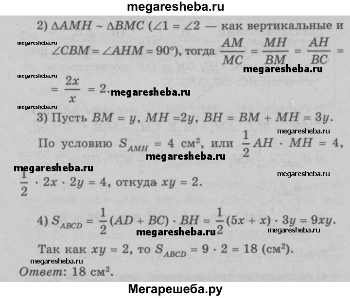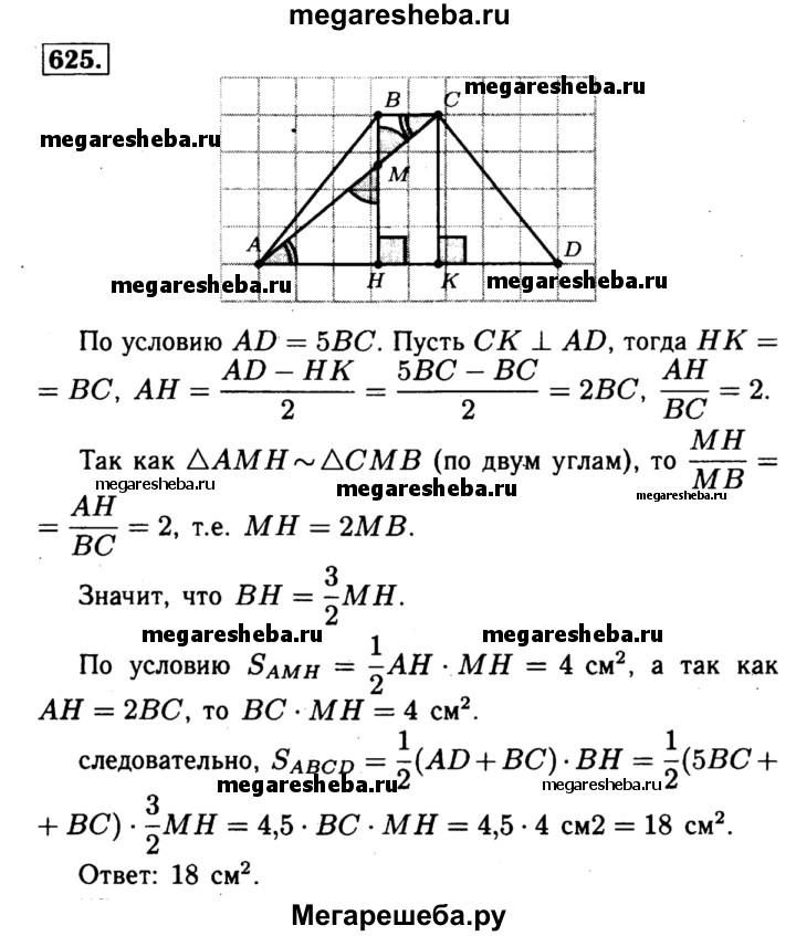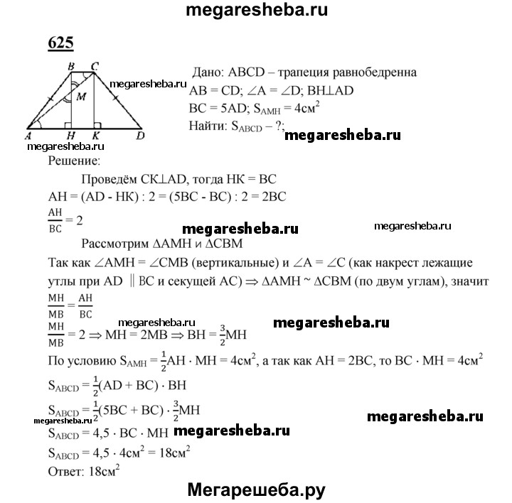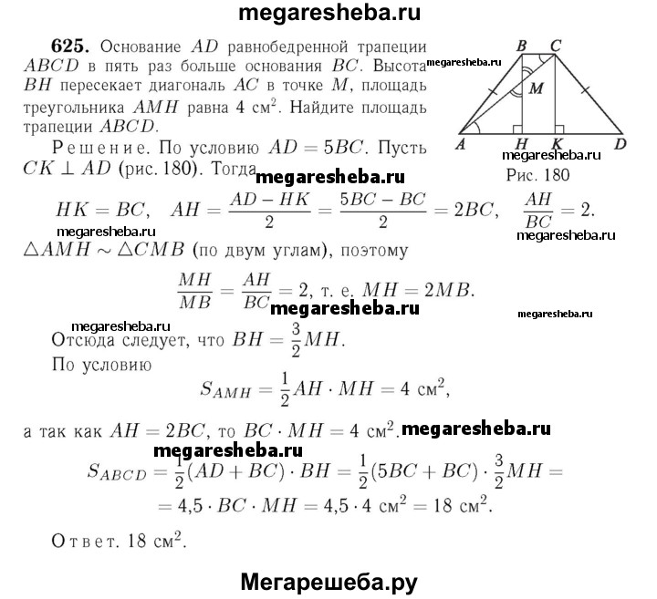 625 Основание AD равнобедренной трапеции ABCD в 5 раз больше основания ВС. Высота ВН пересекает диагональ АС в точке М, площадь треугольника АМН равна 4 см2. Найдите площадь трапеции ABCD.