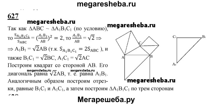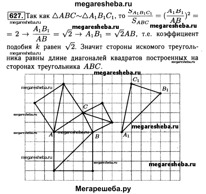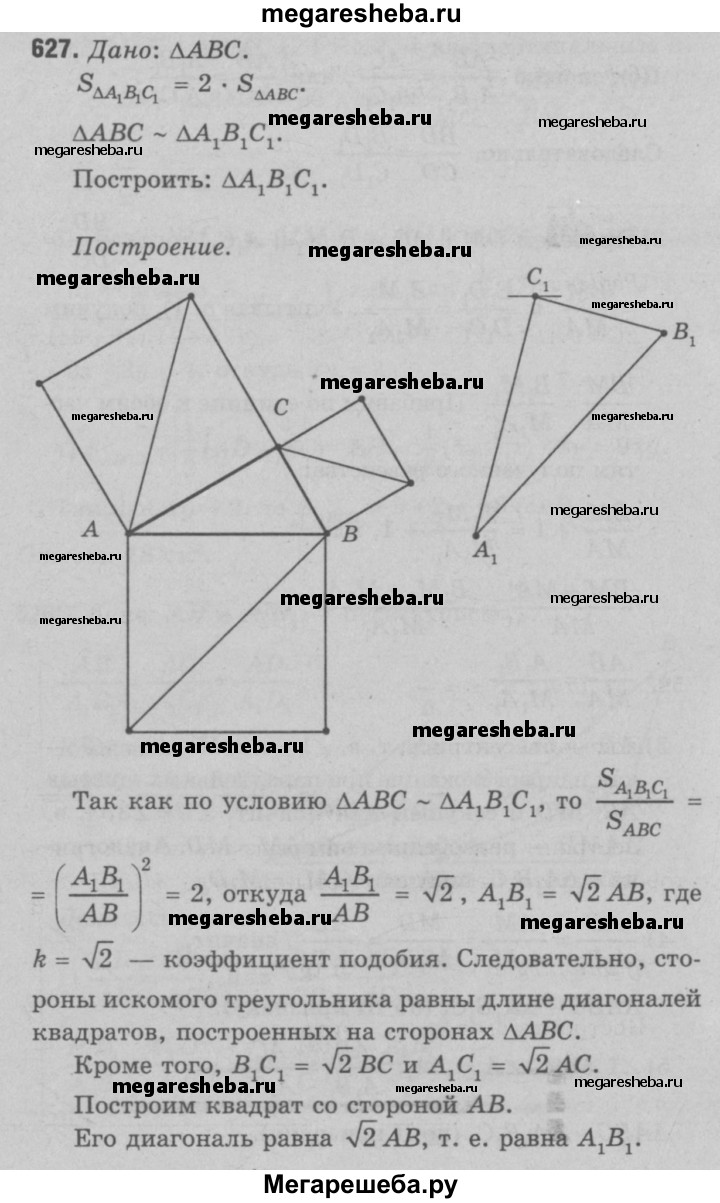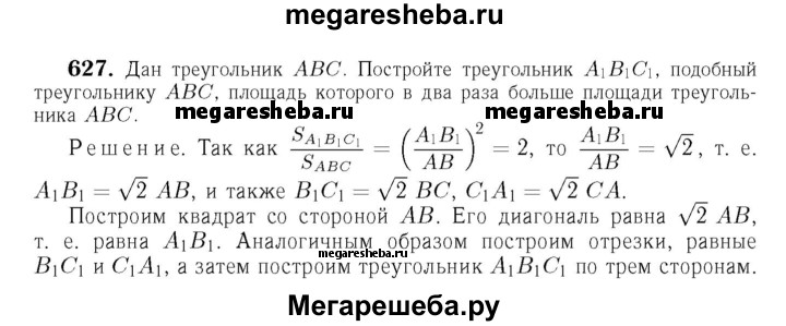 627 Дан треугольник ABC. Постройте треугольник А1В1С1, подобный треугольнику ABC, площадь которого в два раза больше площади треугольника ABC.