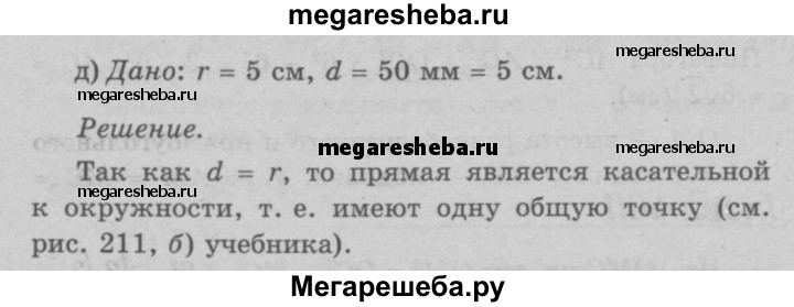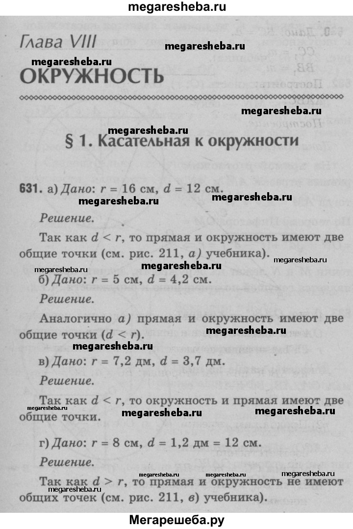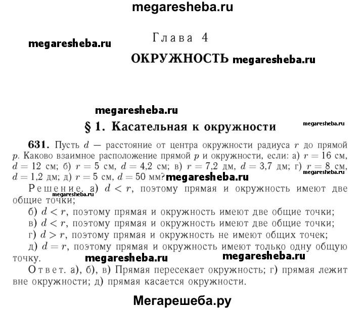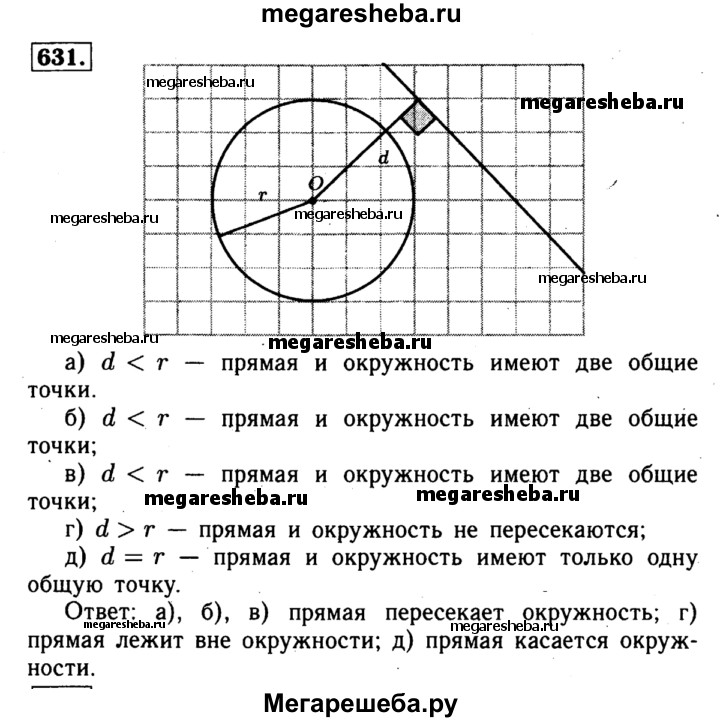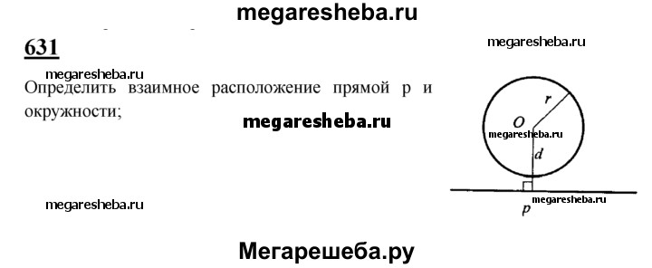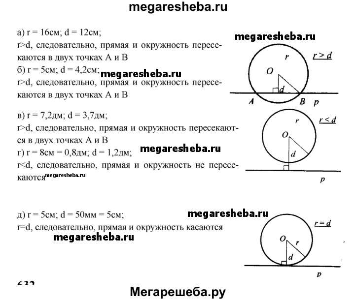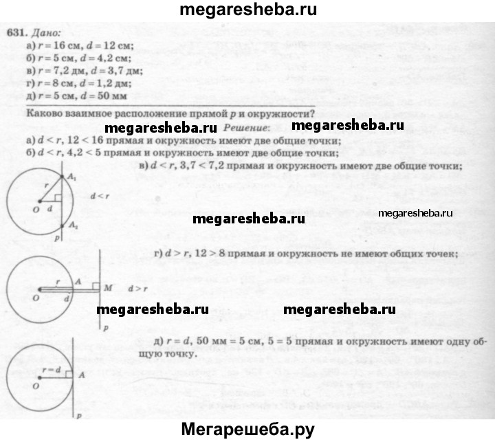 631 Пусть d — расстояние от центра окружности радиуса г до прямой р. Каково взаимное расположение прямой р и окружности, если: а) r = 16 см, d= 12 см; б) r = 5 см, d = 4,2 см; в) r=7,2дм, d = 3,7 дм; г) r = 8 см, d = 1,2 дм; д) r = 5 см, d = 50 мм?