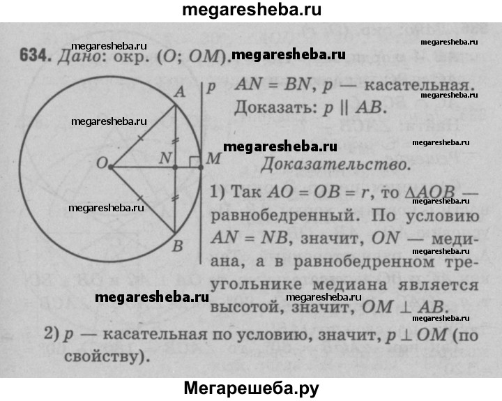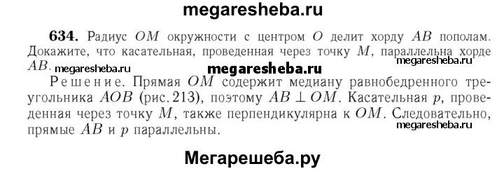 634 Радиус ОМ окружности с центром О делит хорду АВ пополам. Докажите, что касательная, проведённая через точку М, параллельна хорде АВ.