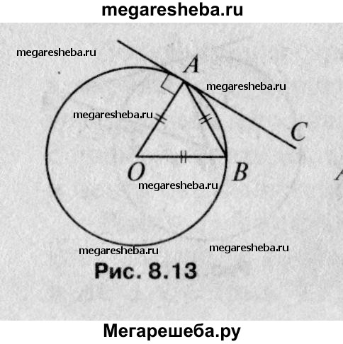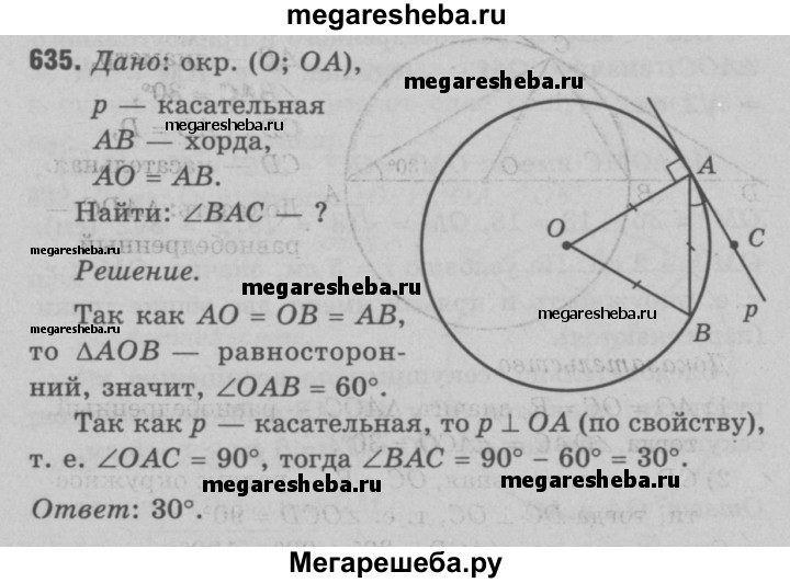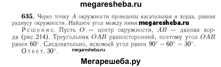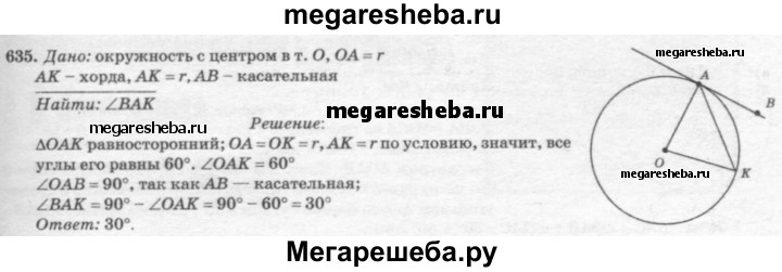 635 Через точку А окружности проведены касательная и хорда, равная радиусу окружности. Найдите угол между ними.