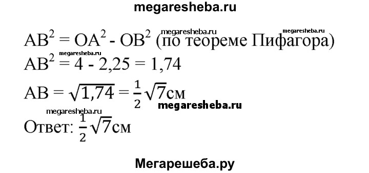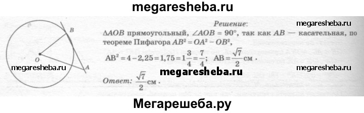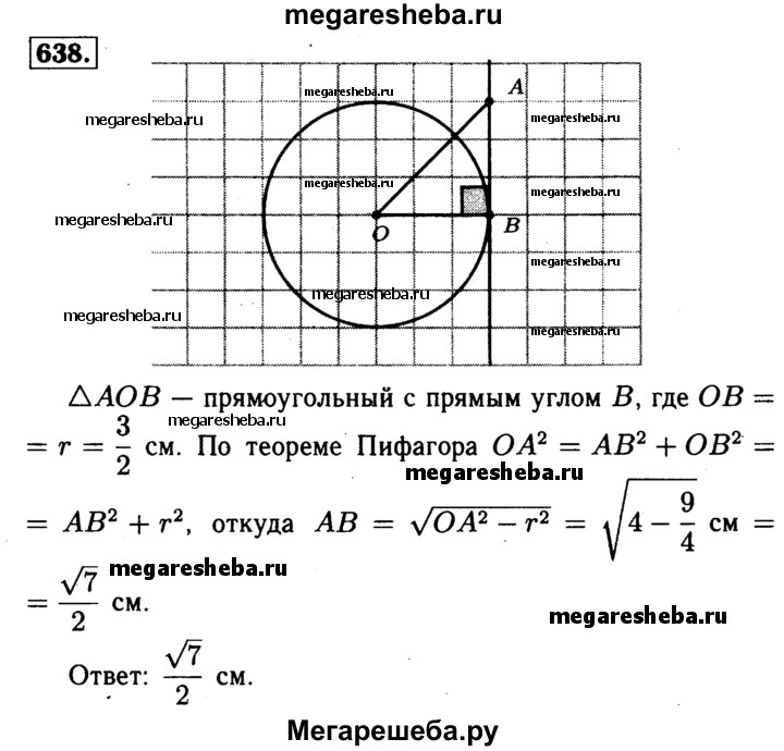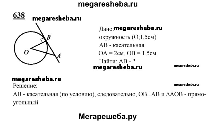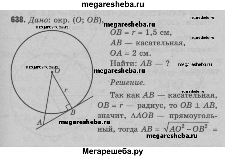 638 Прямая АВ касается окружности с центром О радиуса г в точке В. Найдите АВ, если OA = 2 см, а г= 1,5 см.