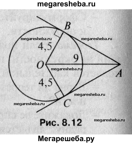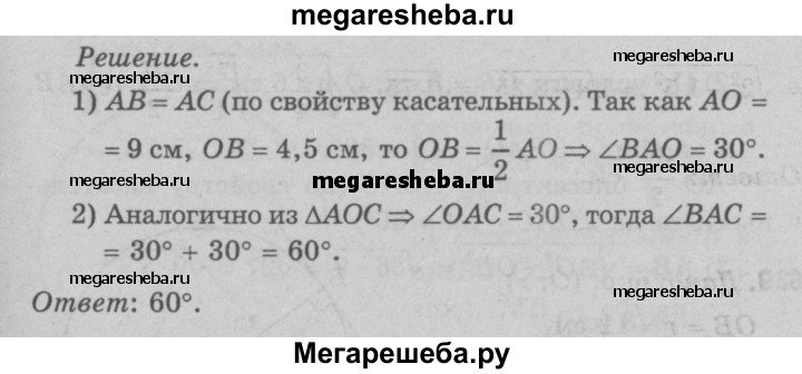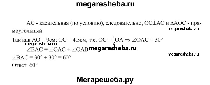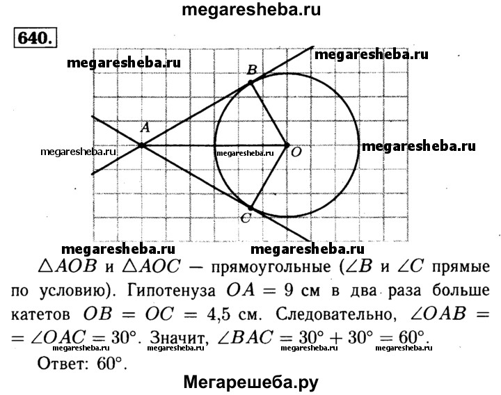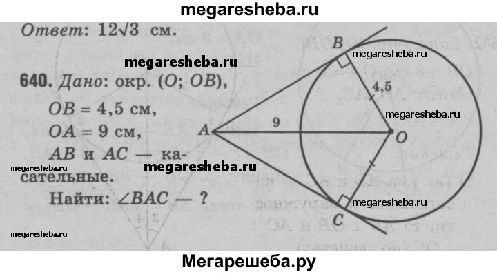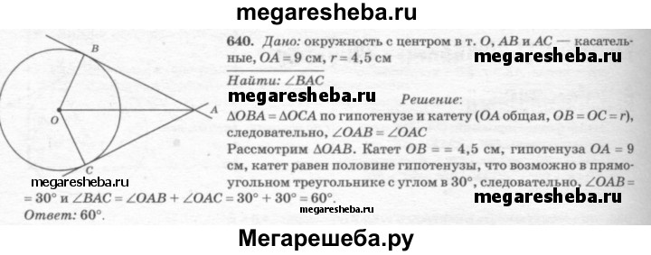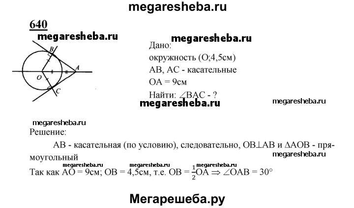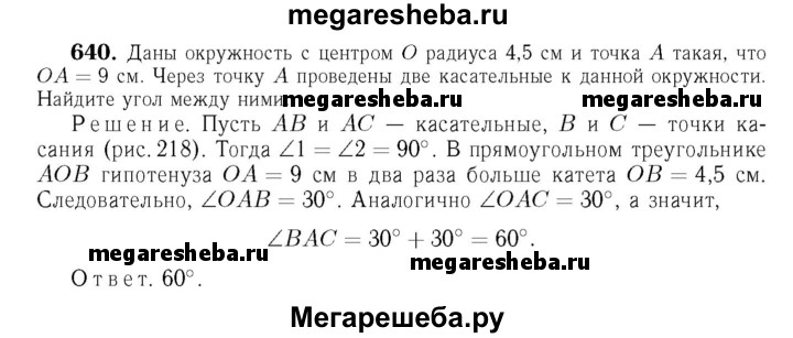 640 Даны окружность с центром О радиуса 4,5 см и точка А. Через точку А проведены две касательные к окружности. Найдите угол между ними, если OA = 9 см.