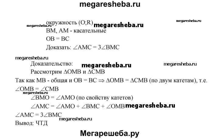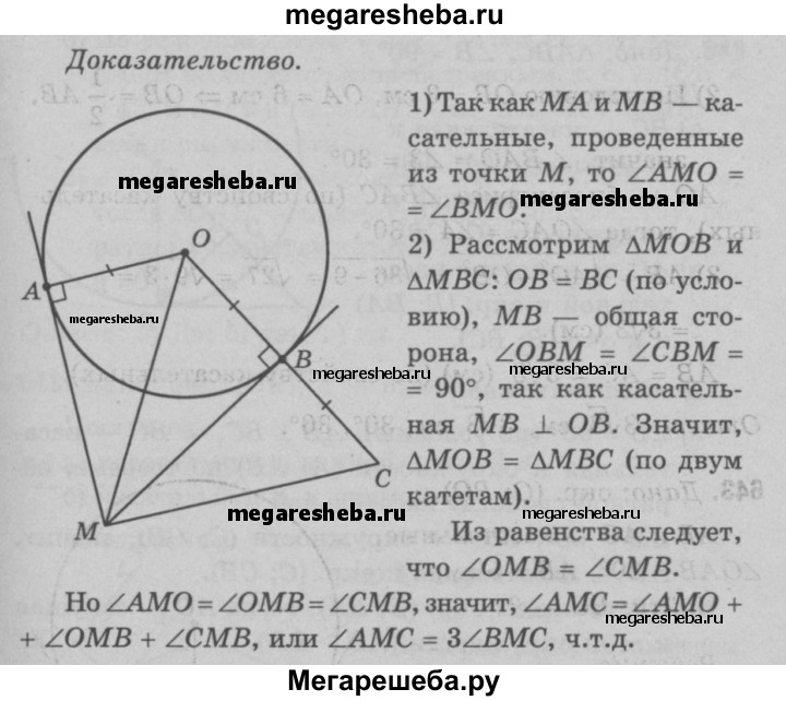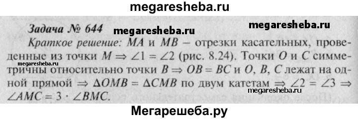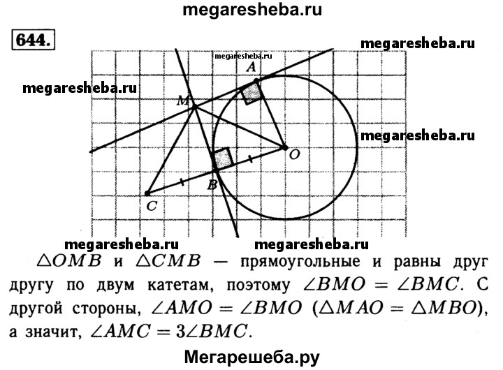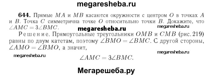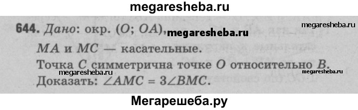 644 Прямые МА и MB касаются окружности с центром О в точках А и В. Точка С симметрична точке О относительно точки В. Докажите, что ∠AMC = 3∠BMC.