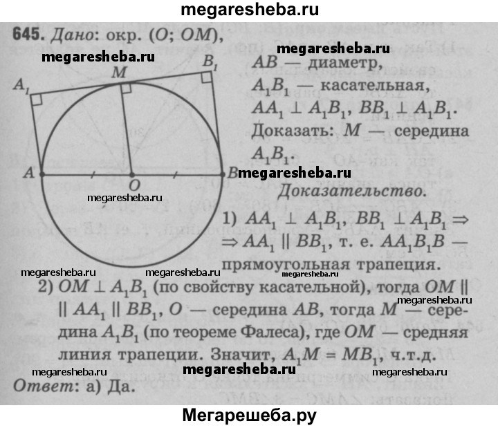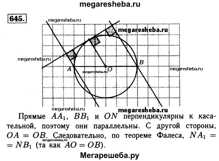 645 Из концов диаметра АВ данной окружности проведены перпендикуляры АА1 и ВВ1 к касательной, которая не перпендикулярна к диаметру АВ. Докажите, что точка касания является серединой отрезка А1В1.