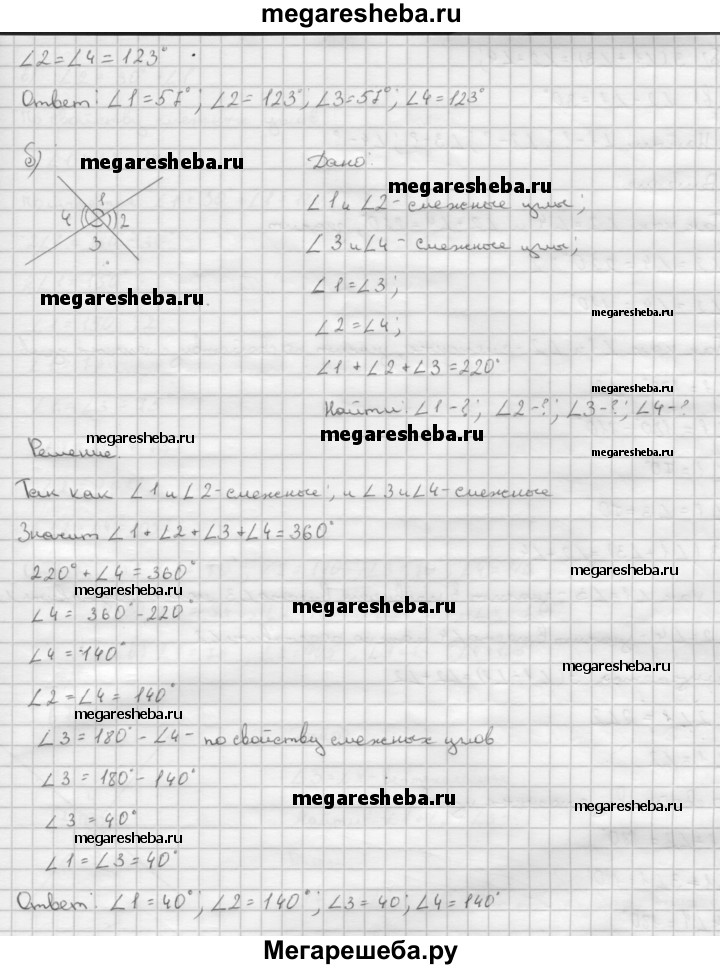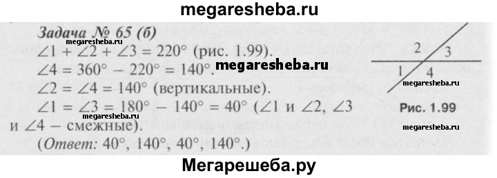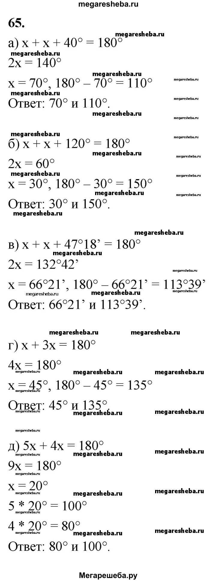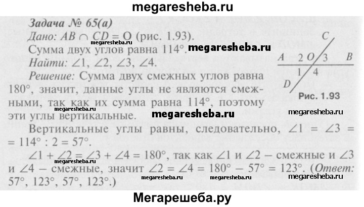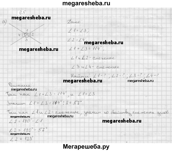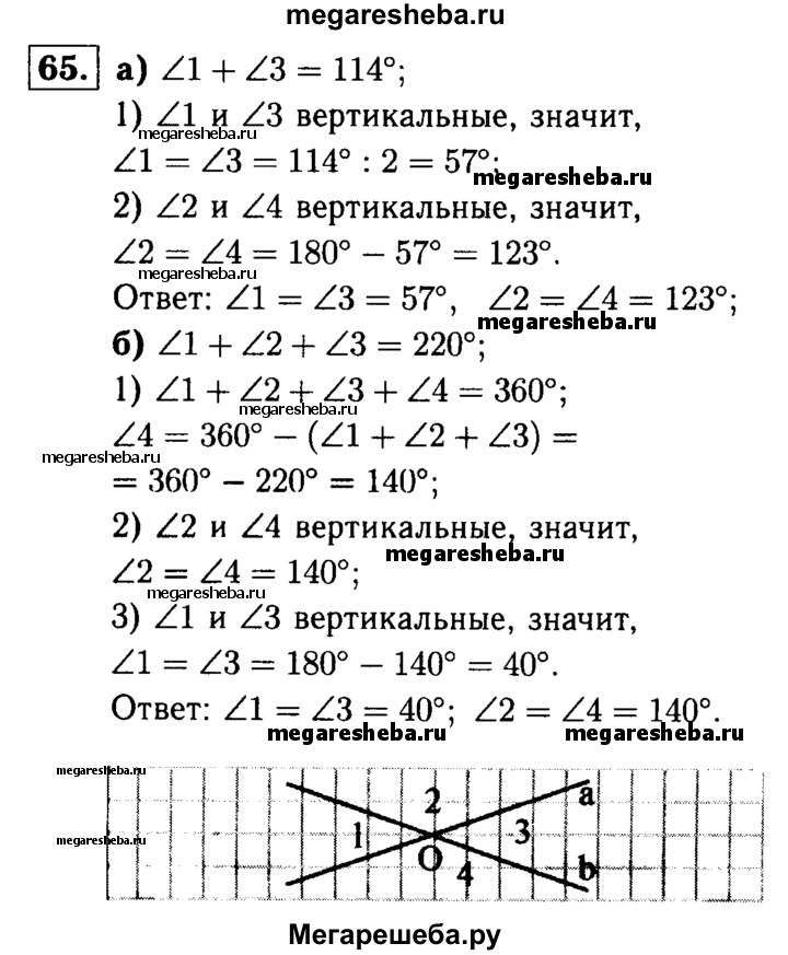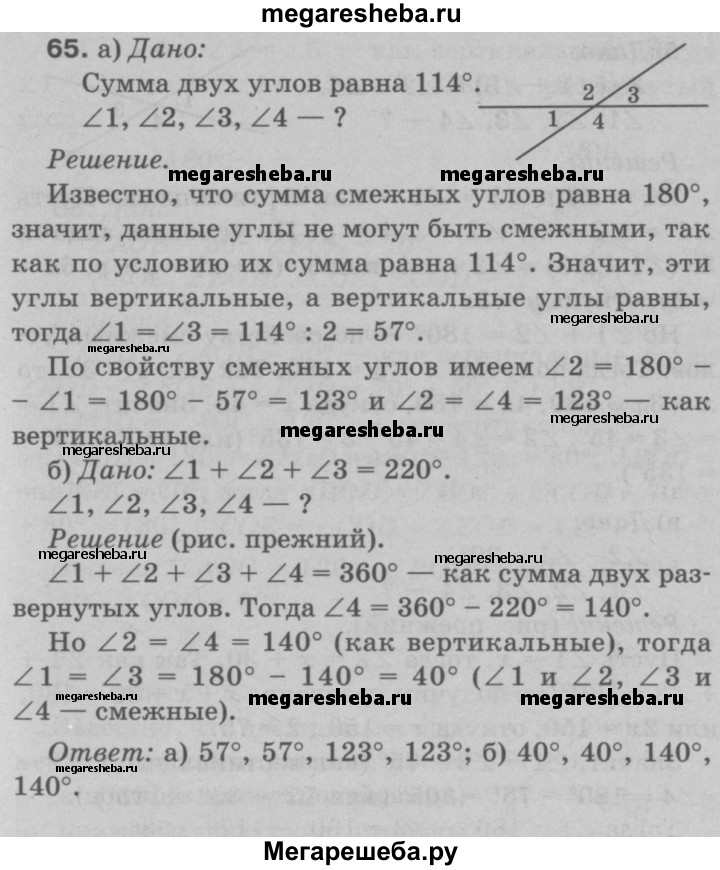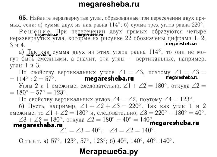 65 Найдите неразвёрнутые углы, образованные при пересечении двух прямых, если: а) сумма двух из них равна 114°; б) сумма трёх углов равна 220°.