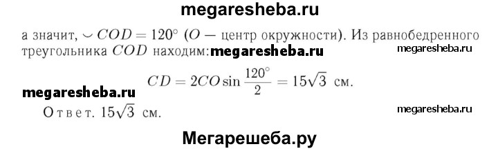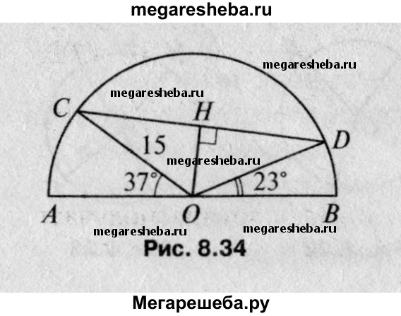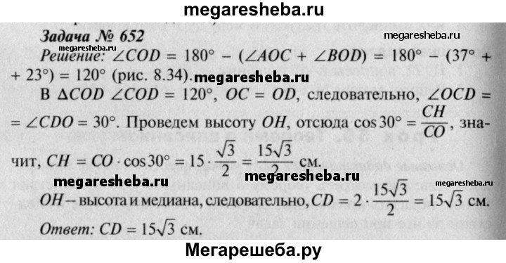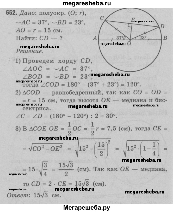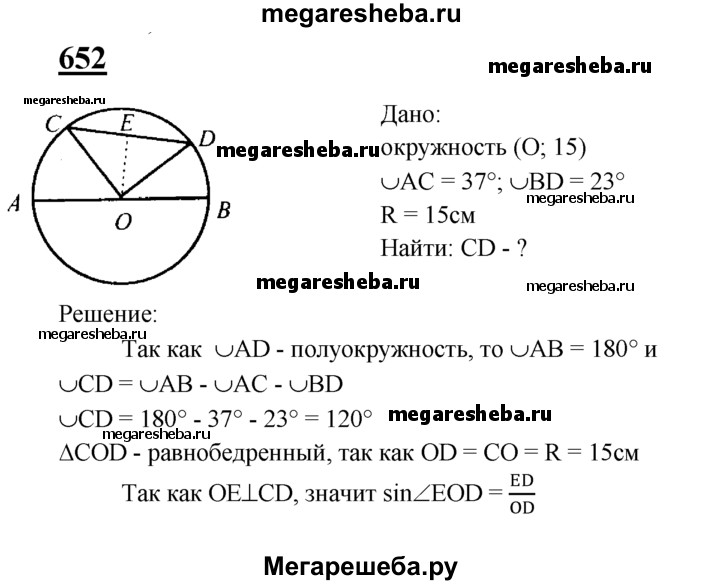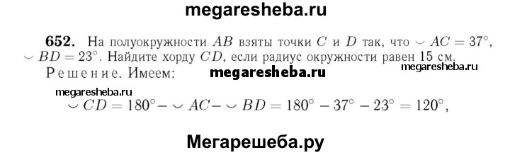 652 На полуокружности АВ взяты точки С и D так, что AC = 37°, BD = 23°. Найдите хорду CD, если радиус окружности равен 15 см.