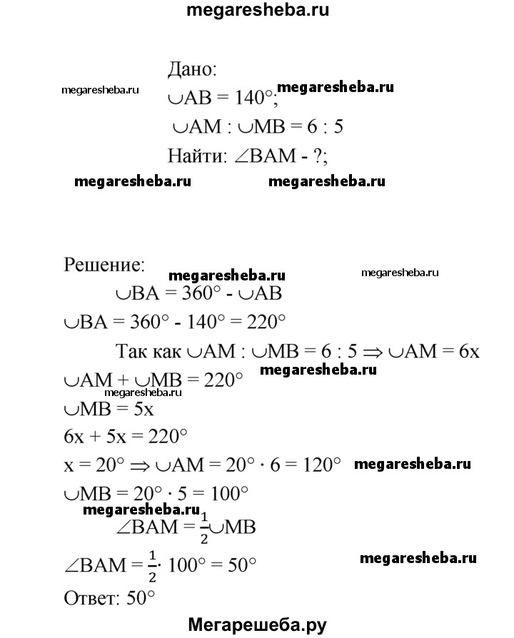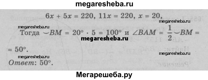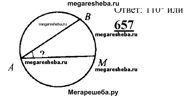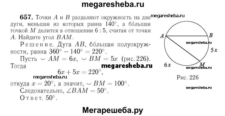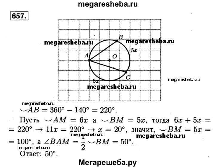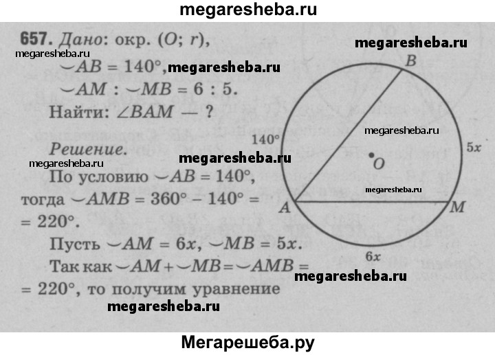 657 Точки А и В разделяют окружность на две дуги, меньшая из которых равна 140°, а большая точкой М делится в отношении 6 : 5, считая от точки А. Найдите угол ВАМ.