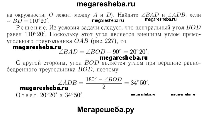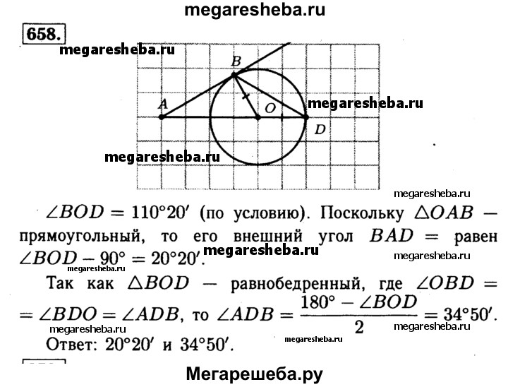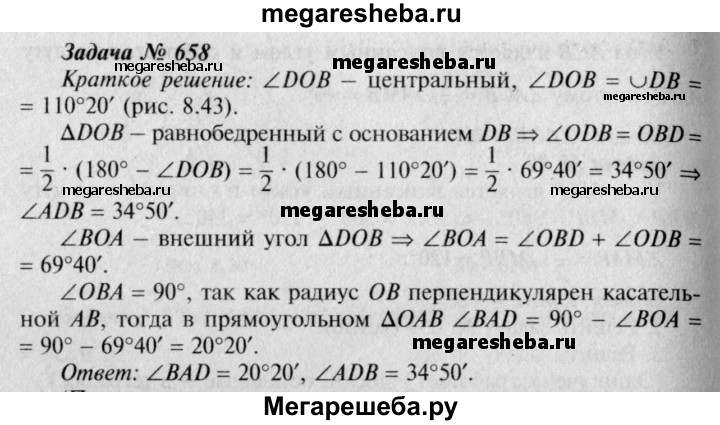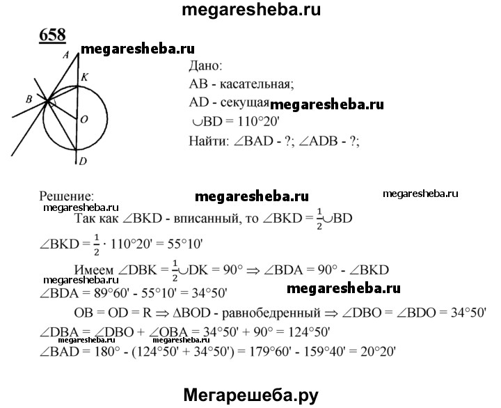 658 Через точку А к данной окружности проведены касательная АВ (В — точка касания) и секущая AD, проходящая через центр О (D — точка на окружности, О лежит между А и D). Найдите ∠BAD и ∠ADB, если BD=110°20'.