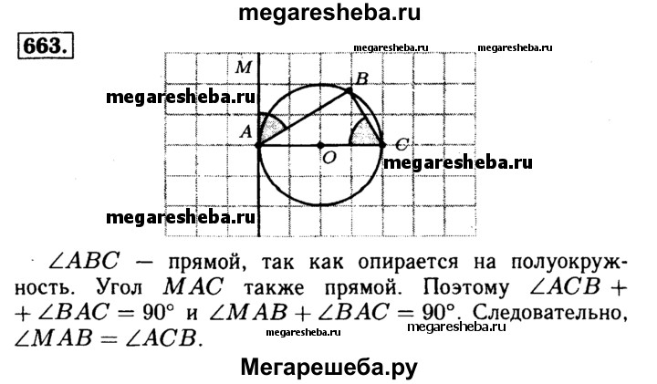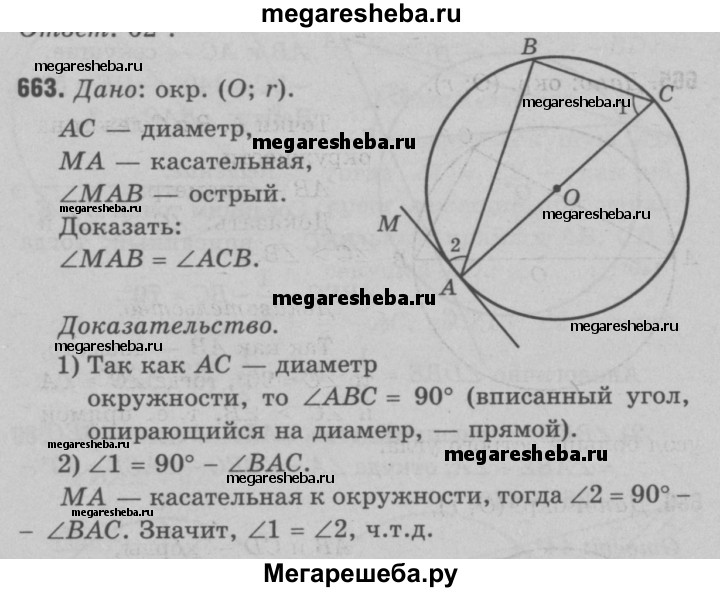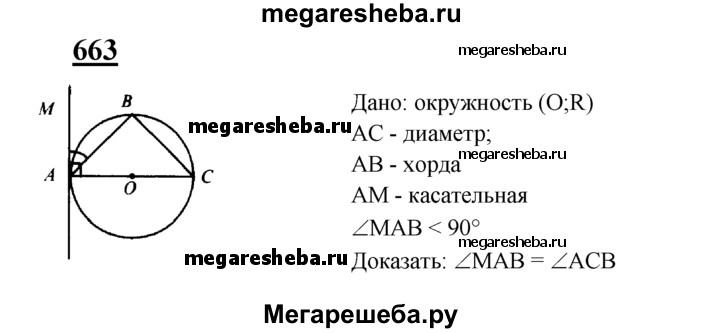 663 Отрезок АС — диаметр окружности, АВ — хорда, МА — касательная, угол МАВ острый. Докажите, что ∠MAB = ∠ACB.