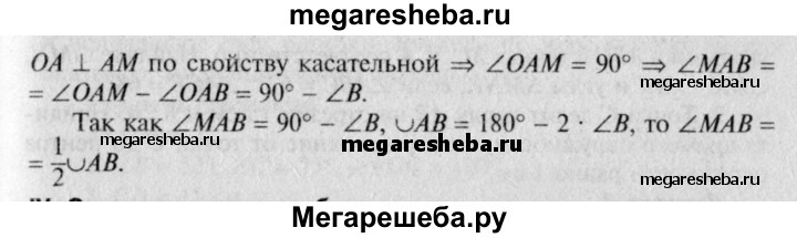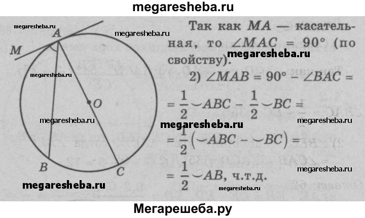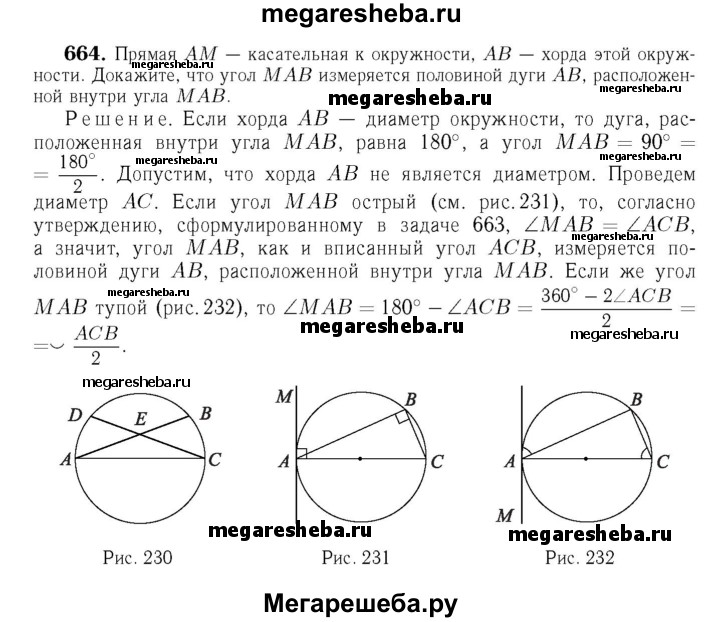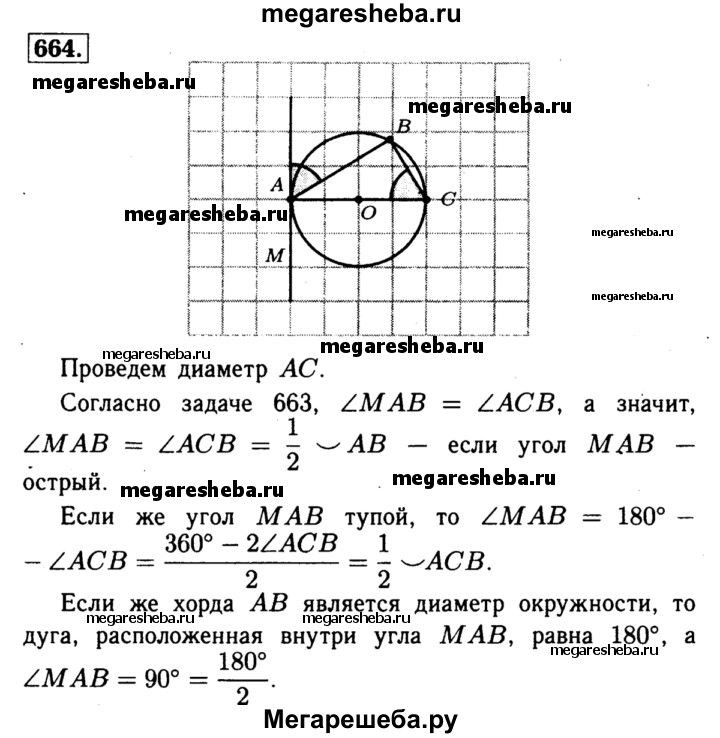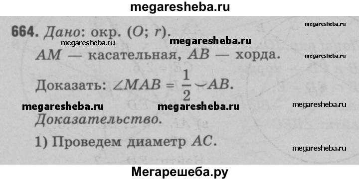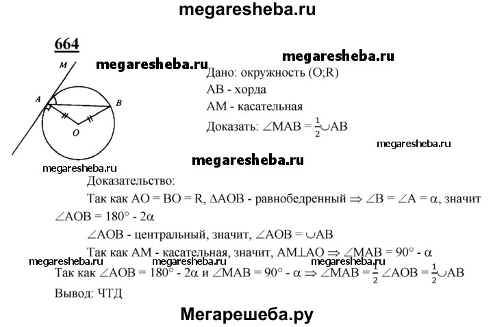 664 Прямая AM — касательная к окружности, АВ — хорда этой окружности. Докажите, что угол МАВ измеряется половиной дуги АВ, расположенной внутри угла МАВ.