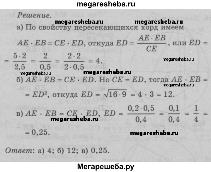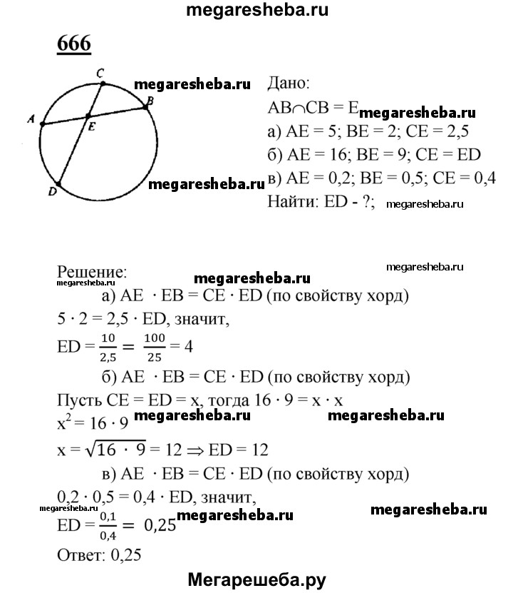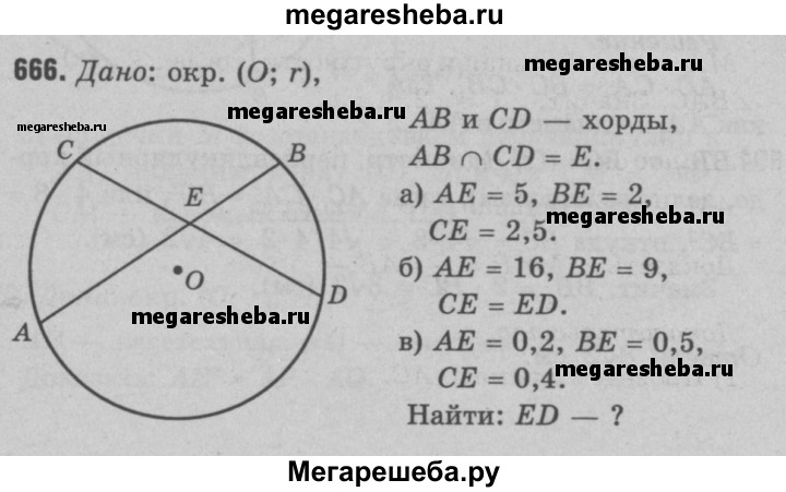 666 Хорды АВ и CD пересекаются в точке Е. Найдите ED, если: а) АЕ = 5, BE = 2, СЕ = 2,5; б) АЕ = 16, BE = 9, CE = ED; в) АE = 0,2, BE = 0,5, С£ = 0,4.