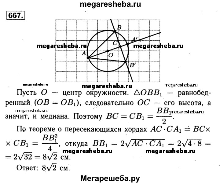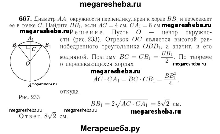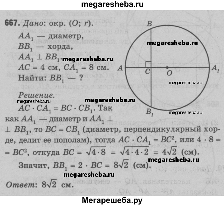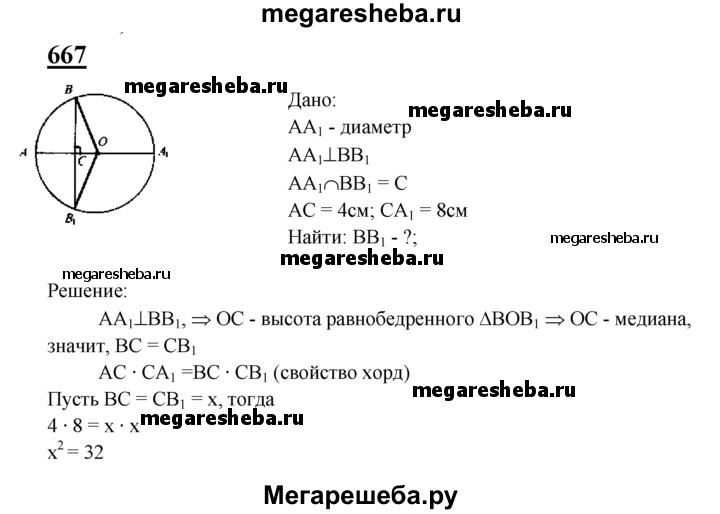 667 Диаметр AA1 окружности перпендикулярен к хорде BB1 и пересекает её в точке С. Найдите ВВХ, если АС = 4 см, CA1 = 8 см.