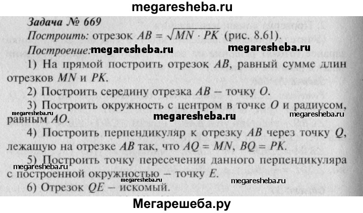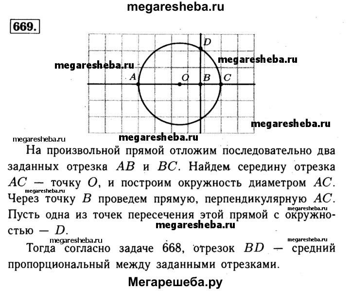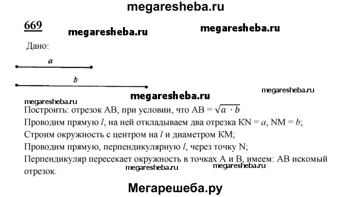 669 Пользуясь утверждением, сформулированным в задаче 668, постройте отрезок, равный среднему пропорциональному для двух данных отрезков.